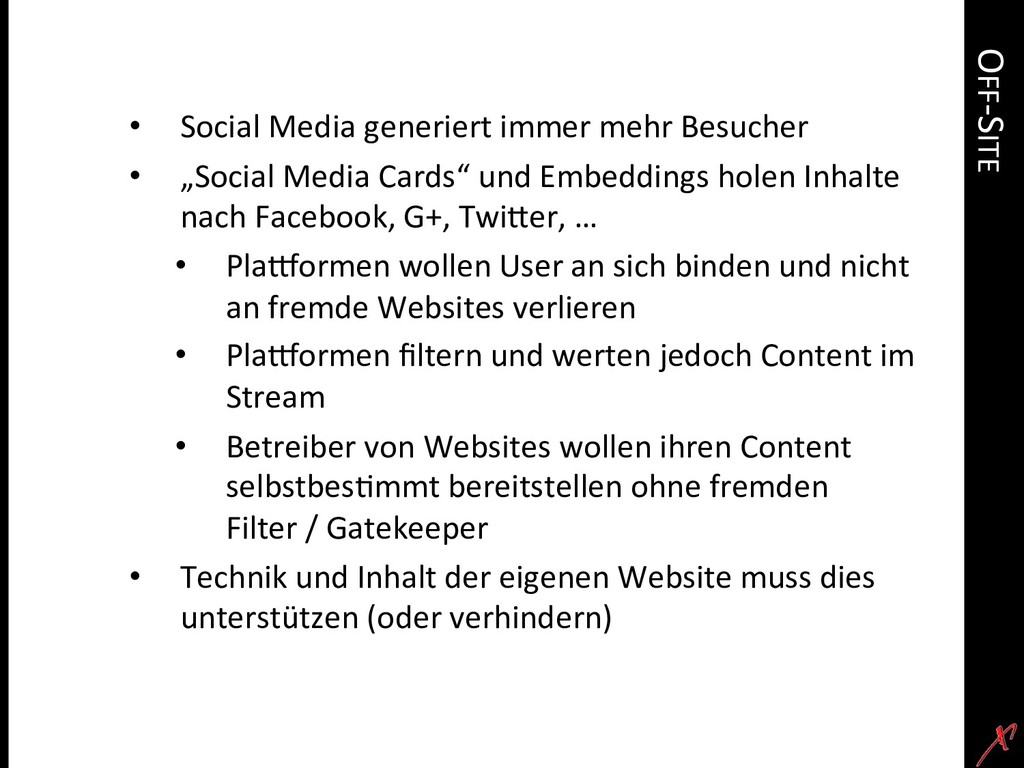 Media Cards“ und Embeddings holen Inhalte nach Facebook, G+, Twifer, … • Pla|ormen wollen User an sich binden und nicht an fremde Websites verlieren • Pla|ormen filtern und werten jedoch Content im Stream • Betreiber von Websites wollen ihren Content selbstbesQmmt bereitstellen ohne fremden Filter / Gatekeeper • Technik und Inhalt der eigenen Website muss dies unterstützen (oder verhindern)