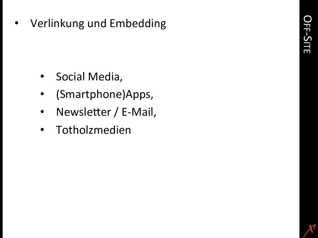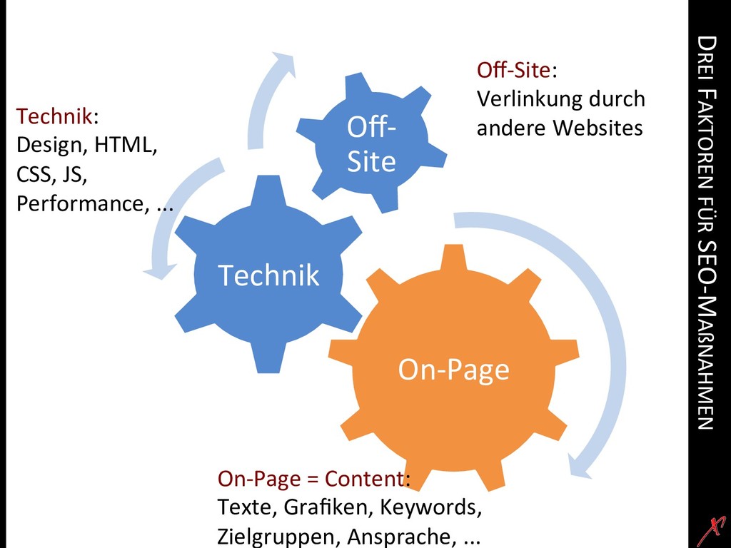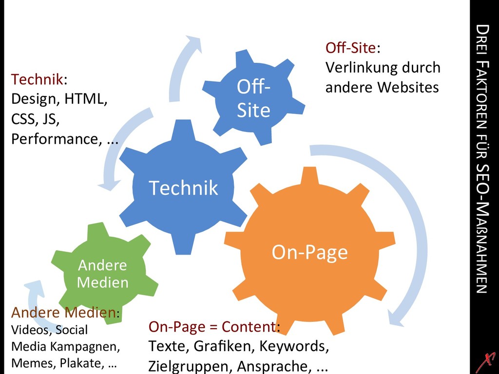 durch andere Websites Andere Medien Technik: Design, HTML, CSS, JS, Performance, ... Andere Medien: Videos, Social Media Kampagnen, Memes, Plakate, … On-Page = Content: Texte, Grafiken, Keywords, Zielgruppen, Ansprache, ...