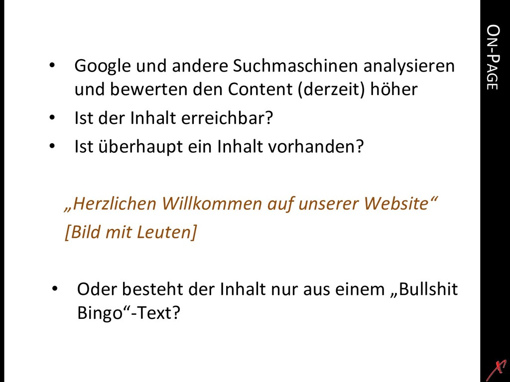 Content (derzeit) höher • Ist der Inhalt erreichbar? • Ist überhaupt ein Inhalt vorhanden? „Herzlichen Willkommen auf unserer Website“ [Bild mit Leuten] • Oder besteht der Inhalt nur aus einem „Bullshit Bingo“-Text?