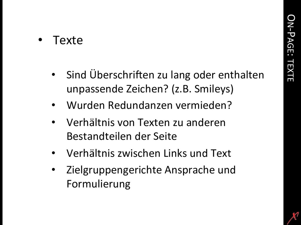 enthalten unpassende Zeichen? (z.B. Smileys) • Wurden Redundanzen vermieden? • Verhältnis von Texten zu anderen Bestandteilen der Seite • Verhältnis zwischen Links und Text • Zielgruppengerichte Ansprache und Formulierung