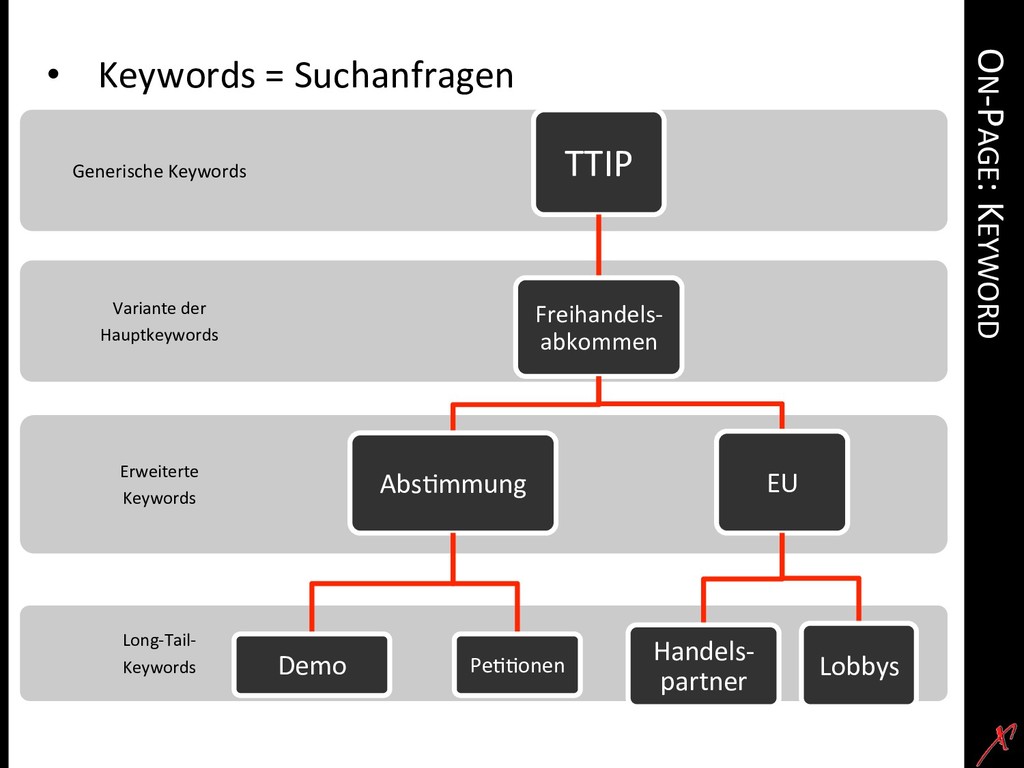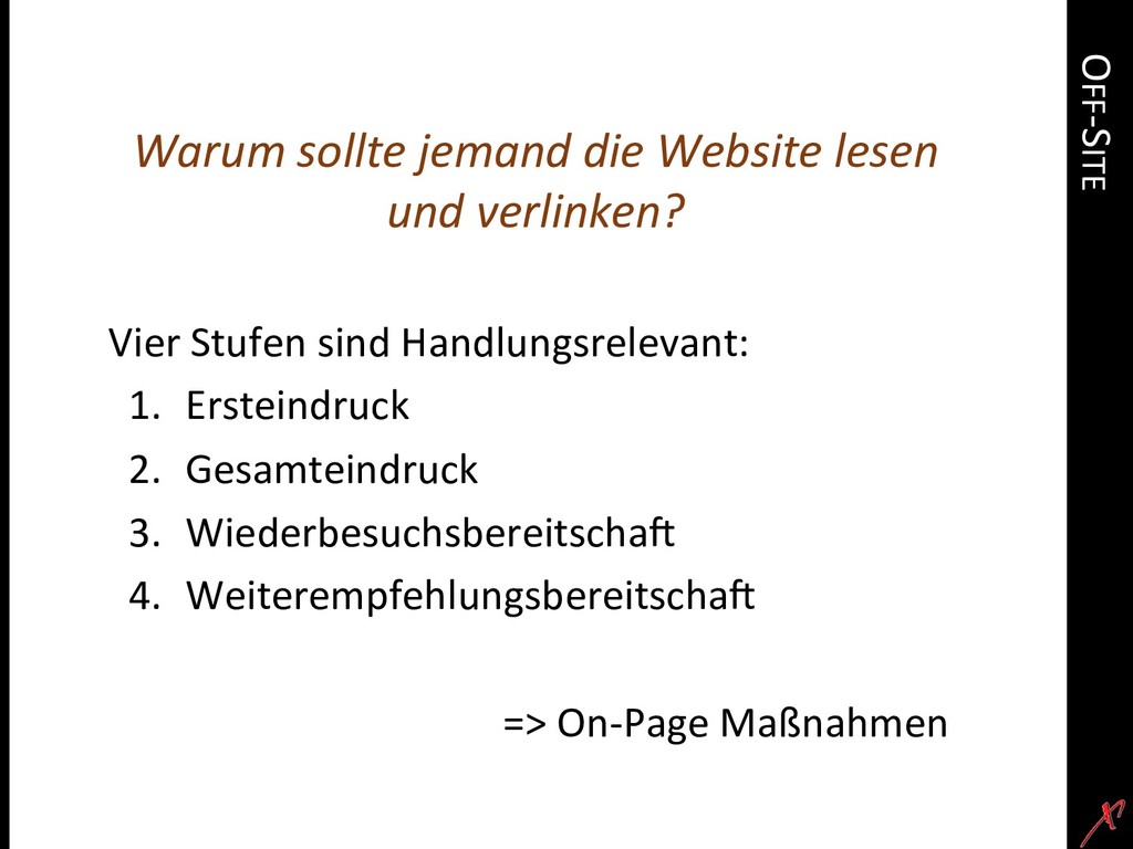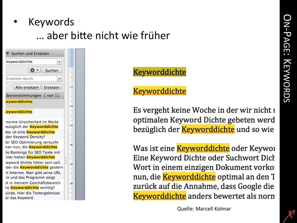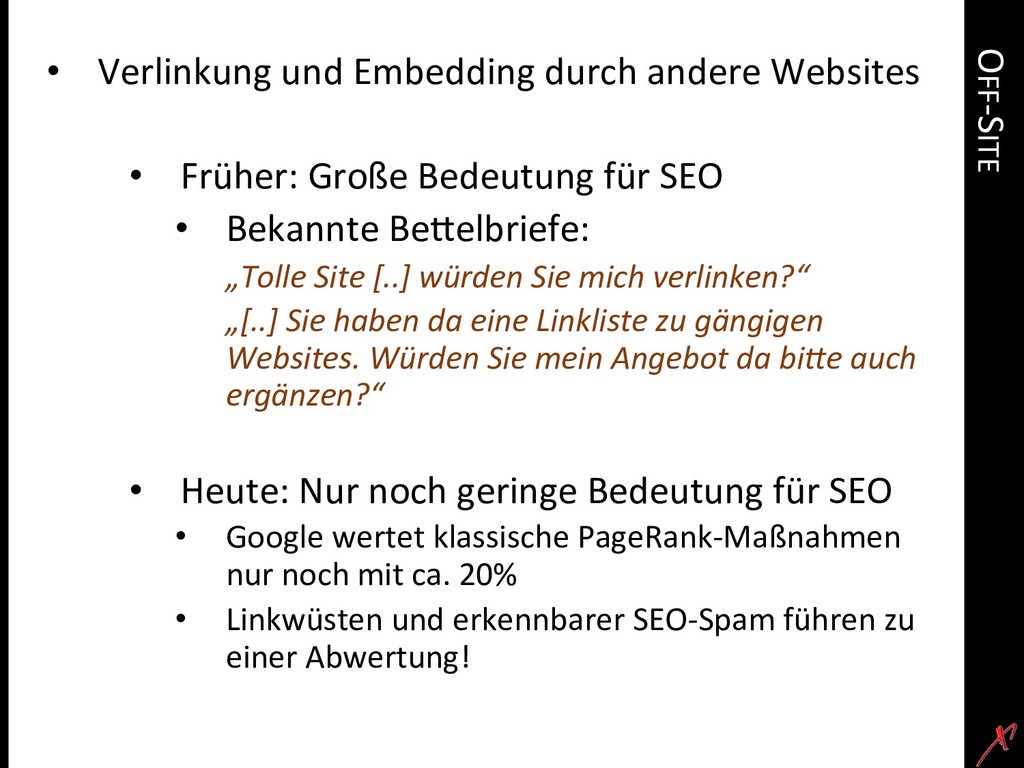 Große Bedeutung für SEO • Bekannte Befelbriefe: „Tolle Site [..] würden Sie mich verlinken?“ „[..] Sie haben da eine Linkliste zu gängigen Websites. Würden Sie mein Angebot da biCe auch ergänzen?“ • Heute: Nur noch geringe Bedeutung für SEO • Google wertet klassische PageRank-Maßnahmen nur noch mit ca. 20% • Linkwüsten und erkennbarer SEO-Spam führen zu einer Abwertung!