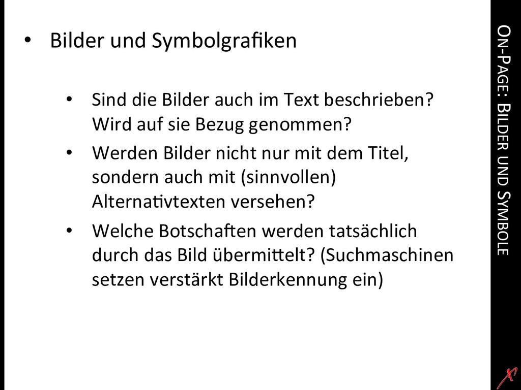 die Bilder auch im Text beschrieben? Wird auf sie Bezug genommen? • Werden Bilder nicht nur mit dem Titel, sondern auch mit (sinnvollen) AlternaQvtexten versehen? • Welche BotschaSen werden tatsächlich durch das Bild übermifelt? (Suchmaschinen setzen verstärkt Bilderkennung ein)