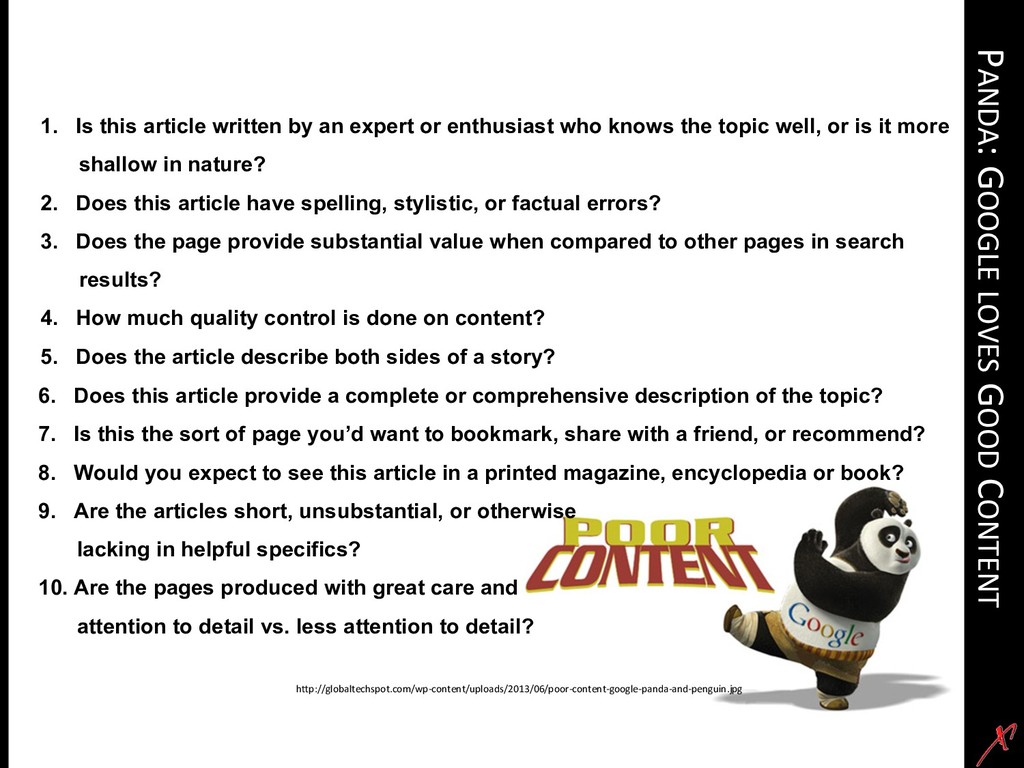 by an expert or enthusiast who knows the topic well, or is it more shallow in nature? 2. Does this article have spelling, stylistic, or factual errors? 3. Does the page provide substantial value when compared to other pages in search results? 4. How much quality control is done on content? 5. Does the article describe both sides of a story? 6. Does this article provide a complete or comprehensive description of the topic? 7. Is this the sort of page you’d want to bookmark, share with a friend, or recommend? 8. Would you expect to see this article in a printed magazine, encyclopedia or book? 9. Are the articles short, unsubstantial, or otherwise lacking in helpful specifics? 10. Are the pages produced with great care and attention to detail vs. less attention to detail? hfp://globaltechspot.com/wp-content/uploads/2013/06/poor-content-google-panda-and-penguin.jpg