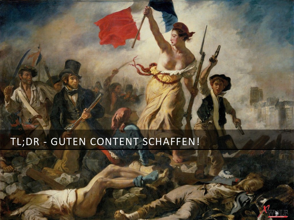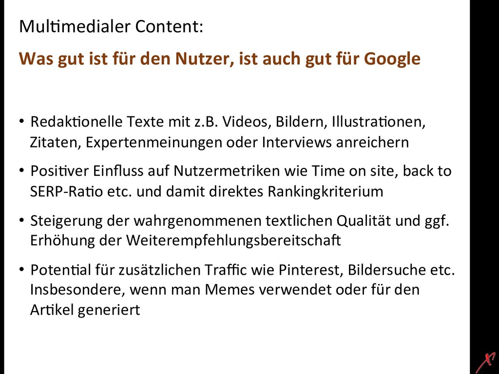 gut für Google • RedakQonelle Texte mit z.B. Videos, Bildern, IllustraQonen, Zitaten, Expertenmeinungen oder Interviews anreichern • PosiQver Einfluss auf Nutzermetriken wie Time on site, back to SERP-RaQo etc. und damit direktes Rankingkriterium • Steigerung der wahrgenommenen textlichen Qualität und ggf. Erhöhung der WeiterempfehlungsbereitschaS • PotenQal für zusätzlichen Traffic wie Pinterest, Bildersuche etc. Insbesondere, wenn man Memes verwendet oder für den ArQkel generiert