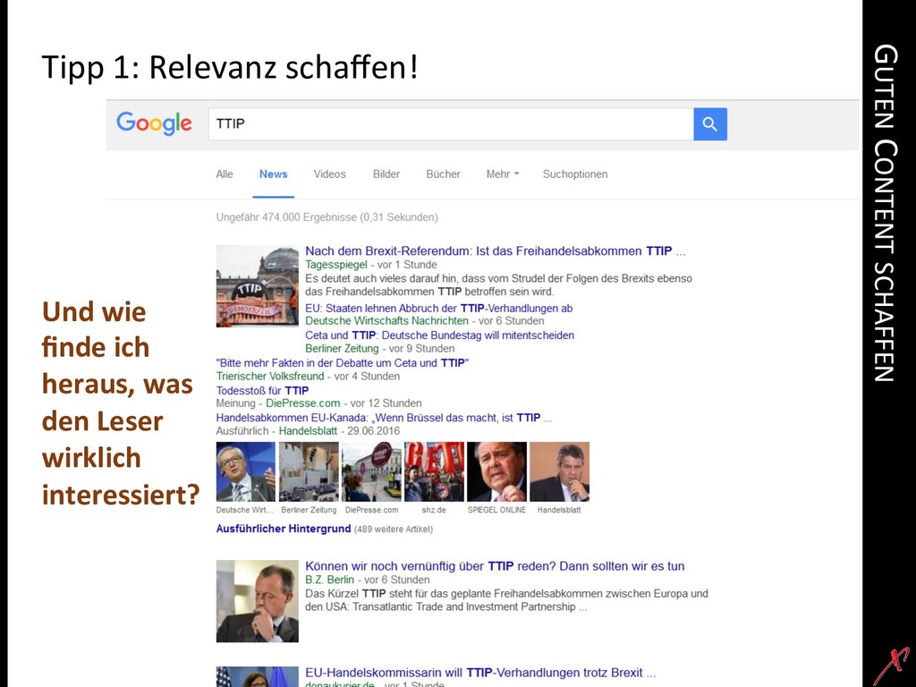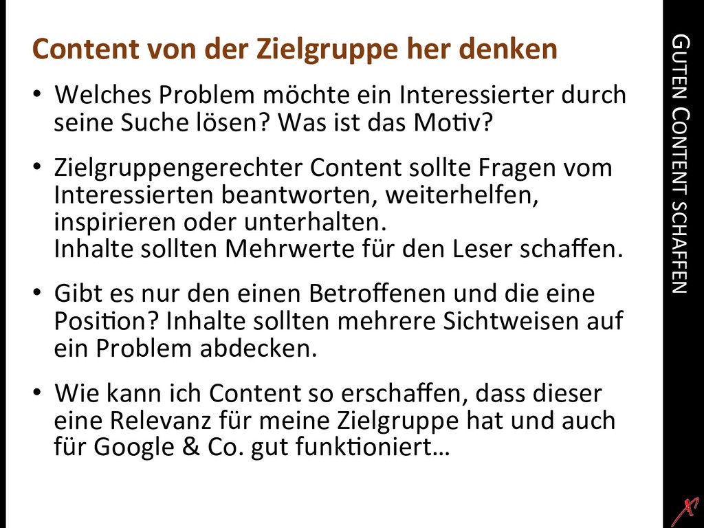 Welches Problem möchte ein Interessierter durch seine Suche lösen? Was ist das MoQv? • Zielgruppengerechter Content sollte Fragen vom Interessierten beantworten, weiterhelfen, inspirieren oder unterhalten. Inhalte sollten Mehrwerte für den Leser schaffen. • Gibt es nur den einen Betroffenen und die eine PosiQon? Inhalte sollten mehrere Sichtweisen auf ein Problem abdecken. • Wie kann ich Content so erschaffen, dass dieser eine Relevanz für meine Zielgruppe hat und auch für Google & Co. gut funkQoniert…