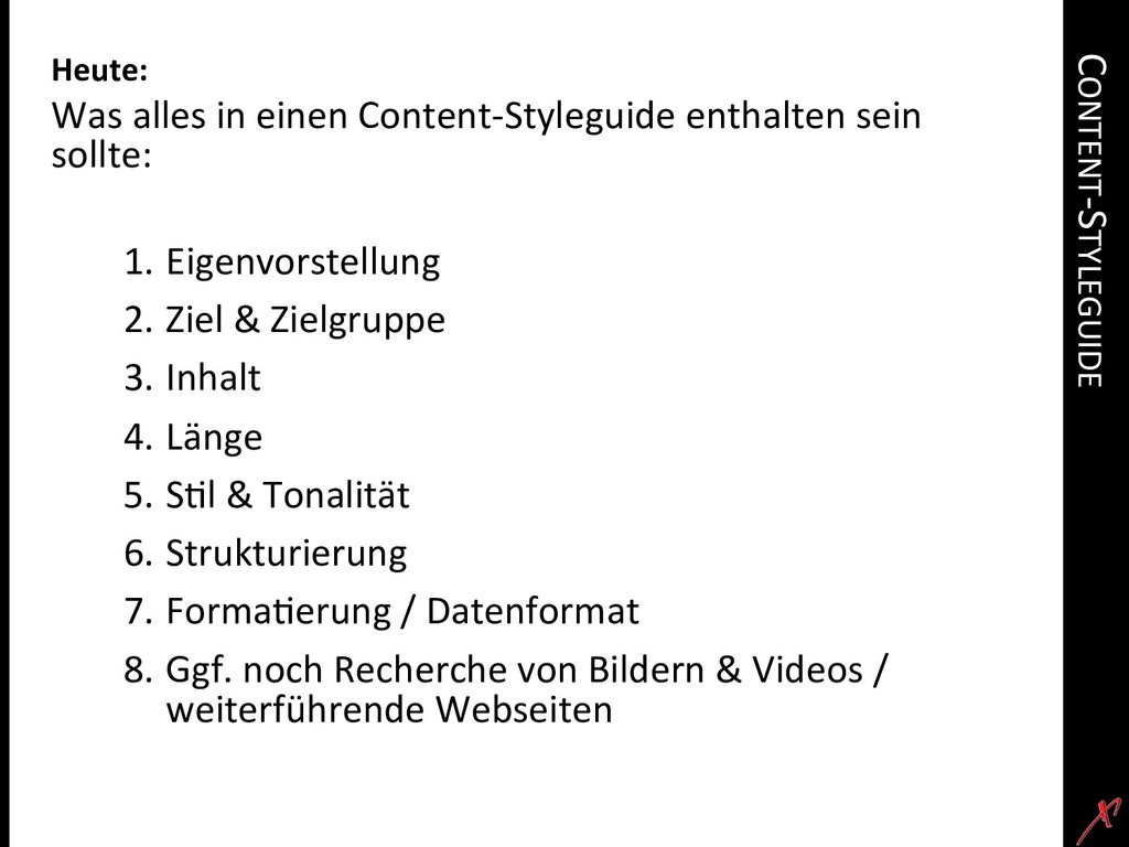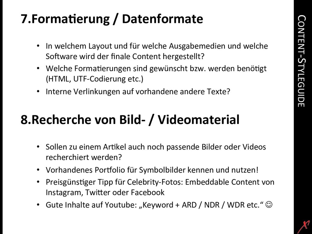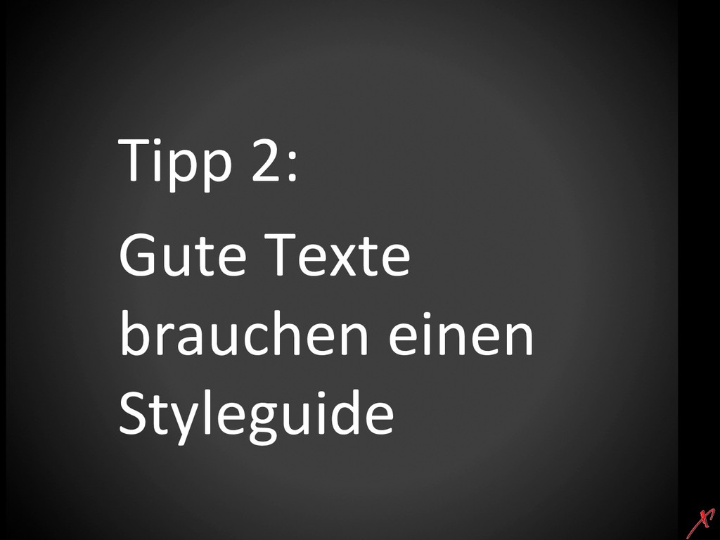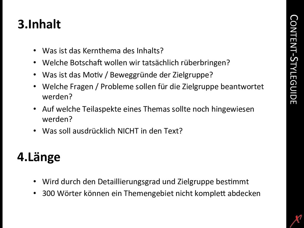 BotschaS wollen wir tatsächlich rüberbringen? • Was ist das MoQv / Beweggründe der Zielgruppe? • Welche Fragen / Probleme sollen für die Zielgruppe beantwortet werden? • Auf welche Teilaspekte eines Themas sollte noch hingewiesen werden? • Was soll ausdrücklich NICHT in den Text? 4. Länge • Wird durch den Detaillierungsgrad und Zielgruppe besQmmt • 300 Wörter können ein Themengebiet nicht komplef abdecken CONTENT-STYLEGUIDE