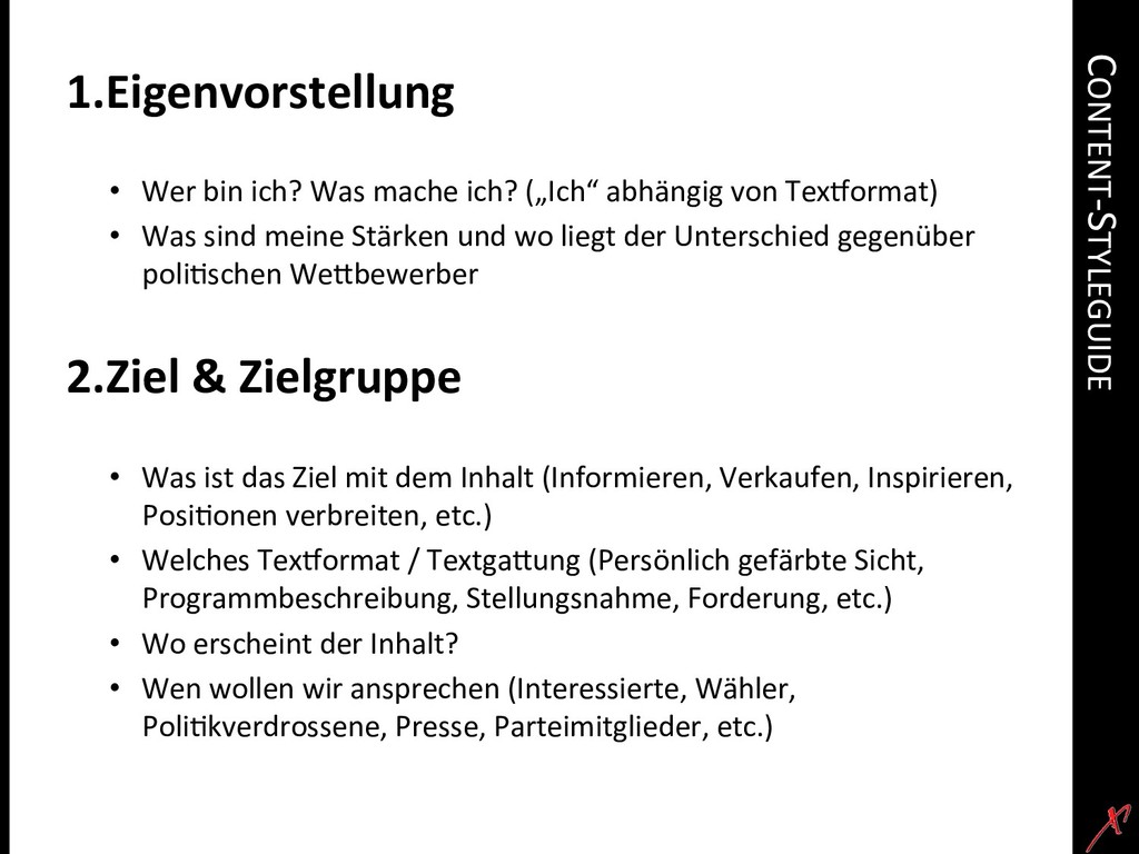von Tex•ormat) • Was sind meine Stärken und wo liegt der Unterschied gegenüber poliQschen Wefbewerber 2. Ziel & Zielgruppe • Was ist das Ziel mit dem Inhalt (Informieren, Verkaufen, Inspirieren, PosiQonen verbreiten, etc.) • Welches Tex•ormat / Textgafung (Persönlich gefärbte Sicht, Programmbeschreibung, Stellungsnahme, Forderung, etc.) • Wo erscheint der Inhalt? • Wen wollen wir ansprechen (Interessierte, Wähler, PoliQkverdrossene, Presse, Parteimitglieder, etc.) CONTENT-STYLEGUIDE