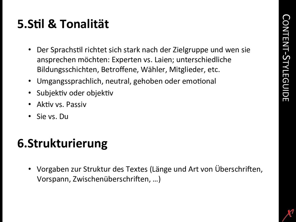 der Zielgruppe und wen sie ansprechen möchten: Experten vs. Laien; unterschiedliche Bildungsschichten, Betroffene, Wähler, Mitglieder, etc. • Umgangssprachlich, neutral, gehoben oder emoQonal • SubjekQv oder objekQv • AkQv vs. Passiv • Sie vs. Du 6. Strukturierung • Vorgaben zur Struktur des Textes (Länge und Art von ÜberschriSen, Vorspann, ZwischenüberschriSen, …) CONTENT-STYLEGUIDE