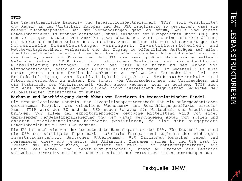 soll Vorschriften und Regeln in der Wirtschaft Europas und der USA langfristig so gestalten, dass sie besser zusammenpassen. Bei den Verhandlungen geht es darum, Zölle und andere Handelsbarrieren im transatlantischen Handel zwischen der Europäischen Union (EU) und den Vereinigten Staaten von Amerika (USA) abzubauen. Ziel ist eine stärkere Öffnung der Märkte auf beiden Seiten des Atlantiks. Zudem sollen mit TTIP Einschränkungen für kommerzielle Dienstleistungen verringert, Investitionssicherheit und Wettbewerbsgleichheit verbessert und der Zugang zu öffentlichen Aufträgen auf allen staatlichen Ebenen vereinfacht werden. Ein transatlantisches Handelsabkommen eröffnet die Chance, dass mit Europa und den USA die zwei größten Handelsräume weltweit Maßstäbe setzen. TTIP kann zur politischen Gestaltung der wirtschaftlichen Globalisierung beitragen. Es darf bei TTIP also nicht um den Abbau von wirtschaftlichen, sozialen oder kulturellen Standards gehen. Im Gegenteil: Es muss darum gehen, dieses Freihandelsabkommen zu weltweiten Fortschritten bei der Berücksichtigung von Nachhaltigkeitsaspekten, Verbraucherschutz und Arbeitnehmerrechten zu nutzen. Der Schutz von Verbraucherinnen und Verbrauchern und die Stabilität der Weltwirtschaft würden zudem wachsen, wenn es gelänge, TTIP auch für eine stärkere Regulierung bislang nicht ausreichend regulierter Bereiche der globalisierten Finanzmärkte zu nutzen. Wachstum und Beschäftigung durch Abbau von Barrieren im transatlantischen Handel Die transatlantische Handels- und Investitionspartnerschaft ist ein außergewöhnliches gemeinsames Projekt, das erhebliche Wachstums- und Beschäftigungseffekte erzielen kann. TTIP wird der EU und den USA neuen Schwung für Wirtschaft und Arbeitsmarkt bringen. Vor allem der exportorientierte deutsche Mittelstand wird von einer umfassenden Handelsliberalisierung und dem damit verbundenen Abbau von Zöllen und anderen Handelshemmnissen besonders profitieren, da eine sehr ausgeprägte Handelsbeziehung zu den USA besteht. Die EU ist nach wie vor der bedeutendste Handelspartner der USA. Für Deutschland sind die USA der wichtigste Exportmarkt außerhalb Europas und zugleich der wichtigste Investitionsstandort deutscher Unternehmen. 800 Millionen Menschen leben und konsumieren dies- und jenseits des Atlantiks. Zusammen machen EU und USA fast 50 Prozent der Weltproduktion, 40 Prozent des Welt-BIP in Kaufkraftparitäten, ein Drittel des Waren- und Dienstleistungshandels, knapp 60 Prozent des Bestands weltweiter Direktinvestitionen und ein Drittel der weltweiten Patentanmeldungen aus. Textquelle: BMWi