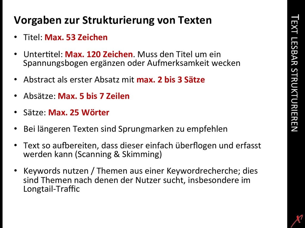 Max. 53 Zeichen • UnterQtel: Max. 120 Zeichen. Muss den Titel um ein Spannungsbogen ergänzen oder Aufmerksamkeit wecken • Abstract als erster Absatz mit max. 2 bis 3 Sätze • Absätze: Max. 5 bis 7 Zeilen • Sätze: Max. 25 Wörter • Bei längeren Texten sind Sprungmarken zu empfehlen • Text so au€ereiten, dass dieser einfach überflogen und erfasst werden kann (Scanning & Skimming) • Keywords nutzen / Themen aus einer Keywordrecherche; dies sind Themen nach denen der Nutzer sucht, insbesondere im Longtail-Traffic
