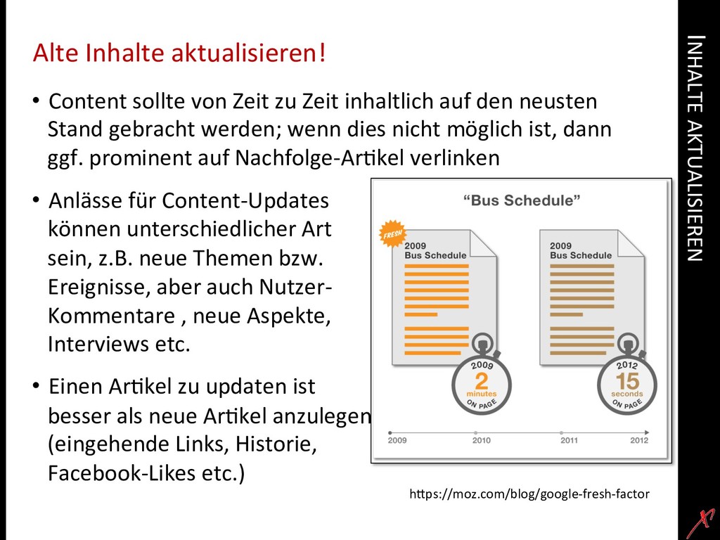 den neusten Stand gebracht werden; wenn dies nicht möglich ist, dann ggf. prominent auf Nachfolge-ArQkel verlinken • Anlässe für Content-Updates können unterschiedlicher Art sein, z.B. neue Themen bzw. Ereignisse, aber auch Nutzer- Kommentare , neue Aspekte, Interviews etc. • Einen ArQkel zu updaten ist besser als neue ArQkel anzulegen (eingehende Links, Historie, Facebook-Likes etc.) INHALTE AKTUALISIEREN Alte Inhalte aktualisieren!