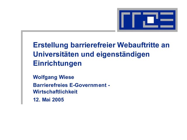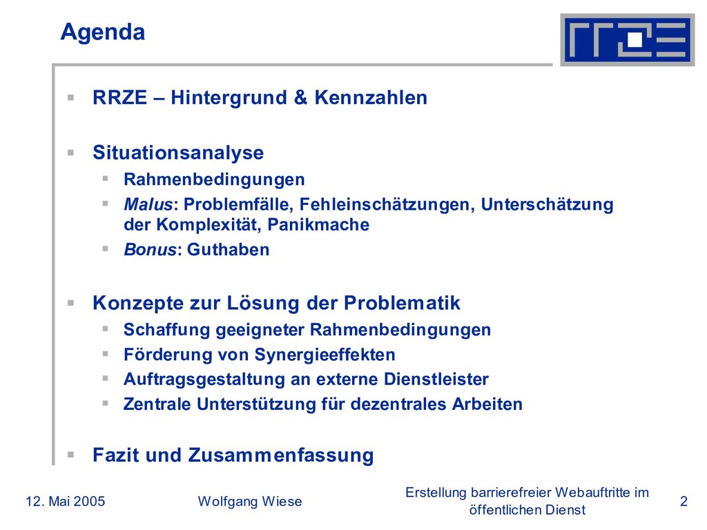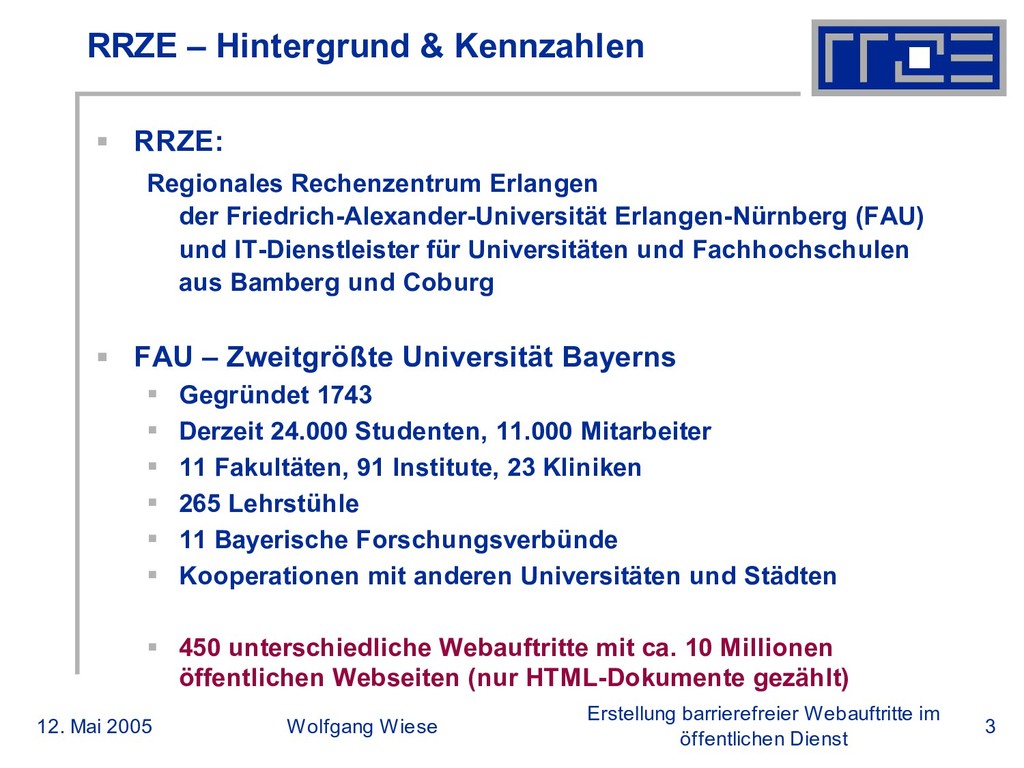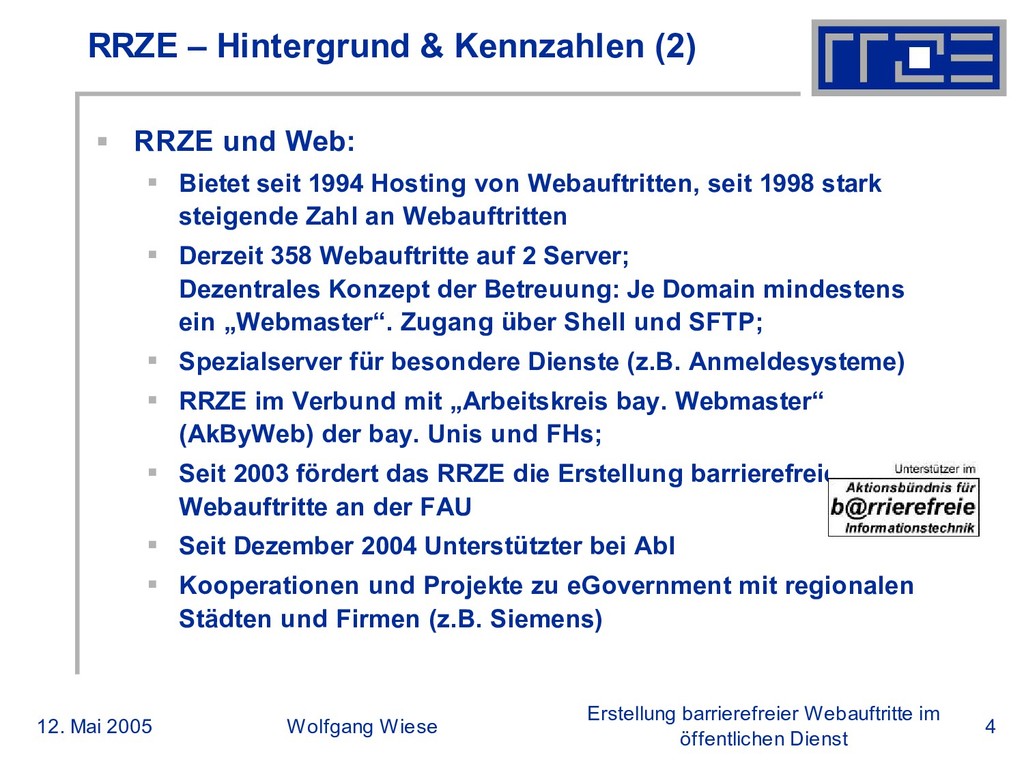 öffentlichen Dienst RRZE – Hintergrund & Kennzahlen (2) RRZE und Web: Bietet seit 1994 Hosting von Webauftritten, seit 1998 stark steigende Zahl an Webauftritten Derzeit 358 Webauftritte auf 2 Server; Dezentrales Konzept der Betreuung: Je Domain mindestens ein „Webmaster“. Zugang über Shell und SFTP; Spezialserver für besondere Dienste (z.B. Anmeldesysteme) RRZE im Verbund mit „Arbeitskreis bay. Webmaster“ (AkByWeb) der bay. Unis und FHs; Seit 2003 fördert das RRZE die Erstellung barrierefreier Webauftritte an der FAU Seit Dezember 2004 Unterstützter bei AbI Kooperationen und Projekte zu eGovernment mit regionalen Städten und Firmen (z.B. Siemens)