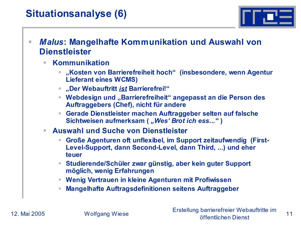 öffentlichen Dienst Situationsanalyse (6) Malus: Mangelhafte Kommunikation und Auswahl von Dienstleister Kommunikation „Kosten von Barrierefreiheit hoch“ (insbesondere, wenn Agentur Lieferant eines WCMS) „Der Webauftritt ist Barrierefrei!“ Webdesign und „Barrierefreiheit“ angepasst an die Person des Auftraggebers (Chef), nicht für andere Gerade Dienstleister machen Auftraggeber selten auf falsche Sichtweisen aufmerksam ( „Wes‘ Brot ich ess...“ ) Auswahl und Suche von Dienstleister Große Agenturen oft unflexibel, im Support zeitaufwendig (First- Level-Support, dann Second-Level, dann Third, ...) und eher teuer Studierende/Schüler zwar günstig, aber kein guter Support möglich, wenig Erfahrungen Wenig Vertrauen in kleine Agenturen mit Profiwissen Mangelhafte Auftragsdefinitionen seitens Auftraggeber