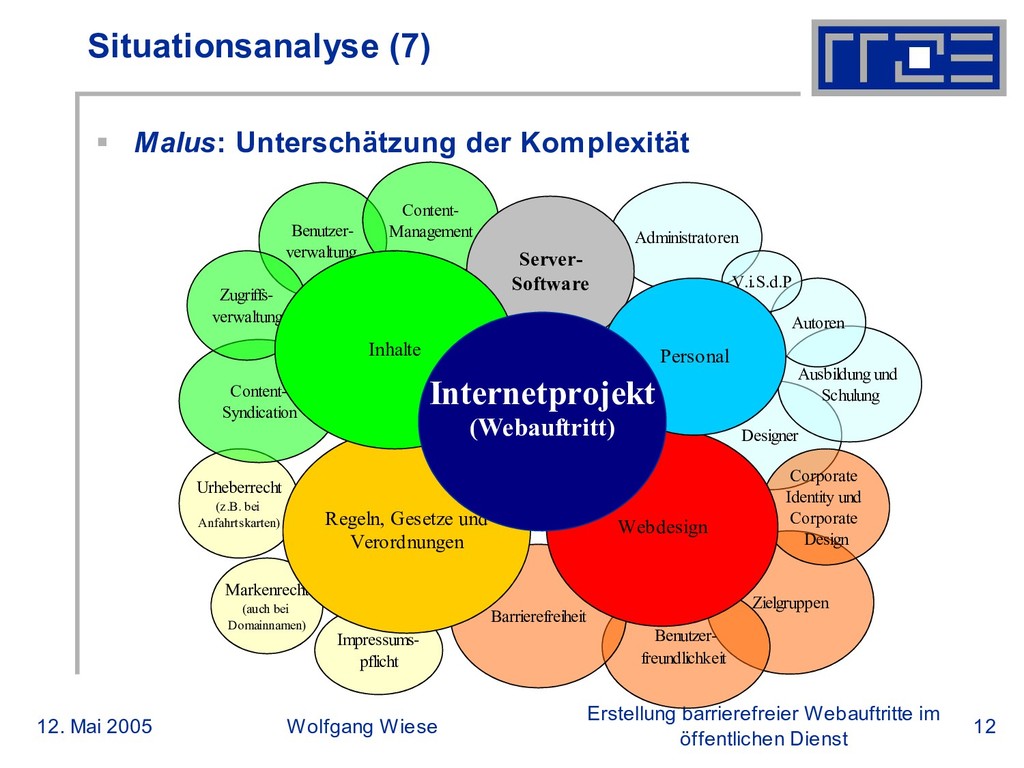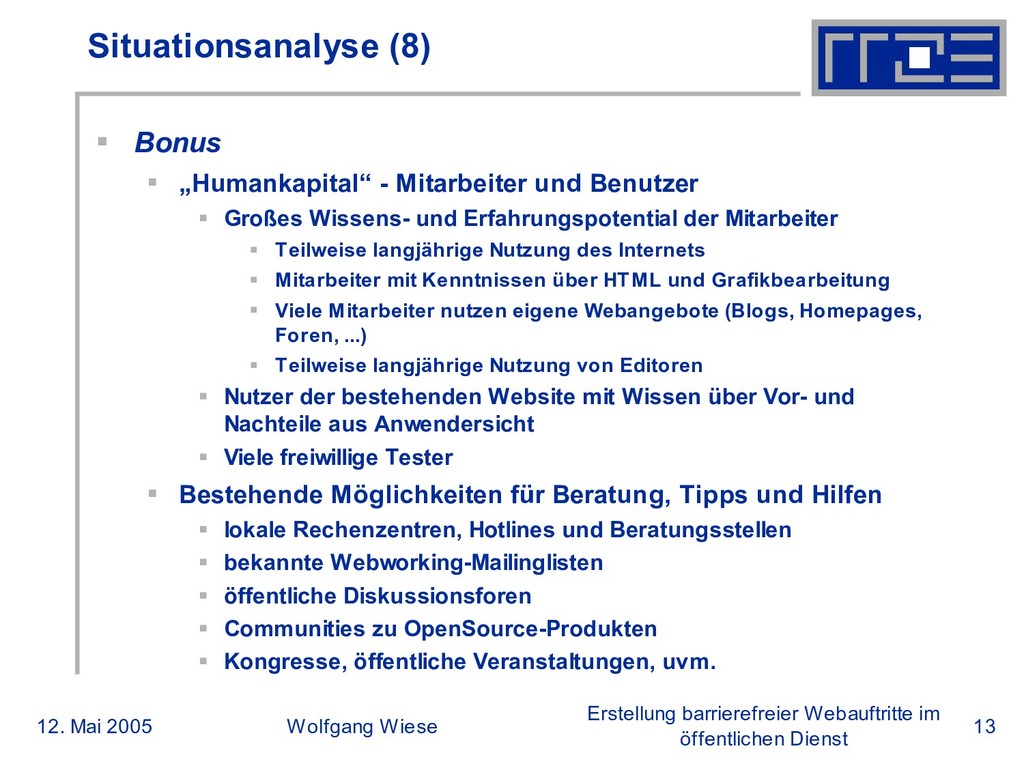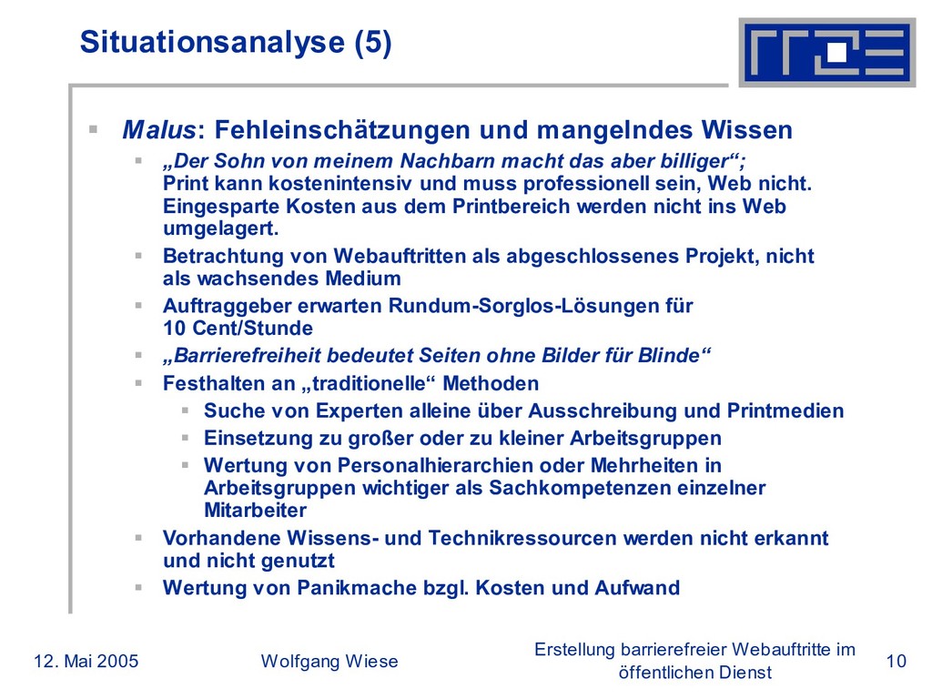 öffentlichen Dienst Situationsanalyse (5) Malus: Fehleinschätzungen und mangelndes Wissen „Der Sohn von meinem Nachbarn macht das aber billiger“; Print kann kostenintensiv und muss professionell sein, Web nicht. Eingesparte Kosten aus dem Printbereich werden nicht ins Web umgelagert. Betrachtung von Webauftritten als abgeschlossenes Projekt, nicht als wachsendes Medium Auftraggeber erwarten Rundum-Sorglos-Lösungen für 10 Cent/Stunde „Barrierefreiheit bedeutet Seiten ohne Bilder für Blinde“ Festhalten an „traditionelle“ Methoden Suche von Experten alleine über Ausschreibung und Printmedien Einsetzung zu großer oder zu kleiner Arbeitsgruppen Wertung von Personalhierarchien oder Mehrheiten in Arbeitsgruppen wichtiger als Sachkompetenzen einzelner Mitarbeiter Vorhandene Wissens- und Technikressourcen werden nicht erkannt und nicht genutzt Wertung von Panikmache bzgl. Kosten und Aufwand