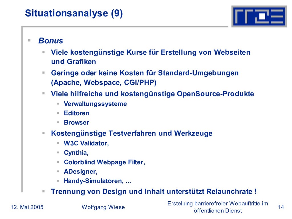 öffentlichen Dienst Situationsanalyse (8) Bonus „Humankapital“ - Mitarbeiter und Benutzer Großes Wissens- und Erfahrungspotential der Mitarbeiter Teilweise langjährige Nutzung des Internets Mitarbeiter mit Kenntnissen über HTML und Grafikbearbeitung Viele Mitarbeiter nutzen eigene Webangebote (Blogs, Homepages, Foren, ...) Teilweise langjährige Nutzung von Editoren Nutzer der bestehenden Website mit Wissen über Vor- und Nachteile aus Anwendersicht Viele freiwillige Tester Bestehende Möglichkeiten für Beratung, Tipps und Hilfen lokale Rechenzentren, Hotlines und Beratungsstellen bekannte Webworking-Mailinglisten öffentliche Diskussionsforen Communities zu OpenSource-Produkten Kongresse, öffentliche Veranstaltungen, uvm.