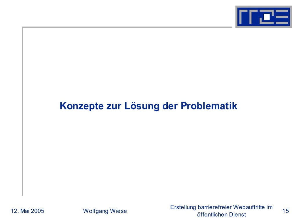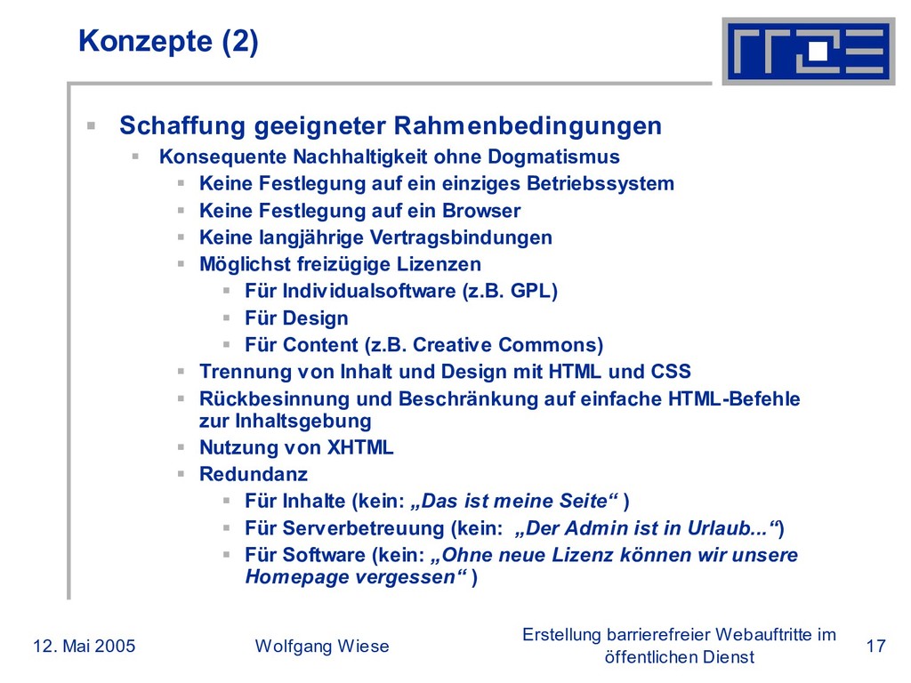 öffentlichen Dienst Konzepte (2) Schaffung geeigneter Rahmenbedingungen Konsequente Nachhaltigkeit ohne Dogmatismus Keine Festlegung auf ein einziges Betriebssystem Keine Festlegung auf ein Browser Keine langjährige Vertragsbindungen Möglichst freizügige Lizenzen Für Individualsoftware (z.B. GPL) Für Design Für Content (z.B. Creative Commons) Trennung von Inhalt und Design mit HTML und CSS Rückbesinnung und Beschränkung auf einfache HTML-Befehle zur Inhaltsgebung Nutzung von XHTML Redundanz Für Inhalte (kein: „Das ist meine Seite“ ) Für Serverbetreuung (kein: „Der Admin ist in Urlaub...“) Für Software (kein: „Ohne neue Lizenz können wir unsere Homepage vergessen“ )