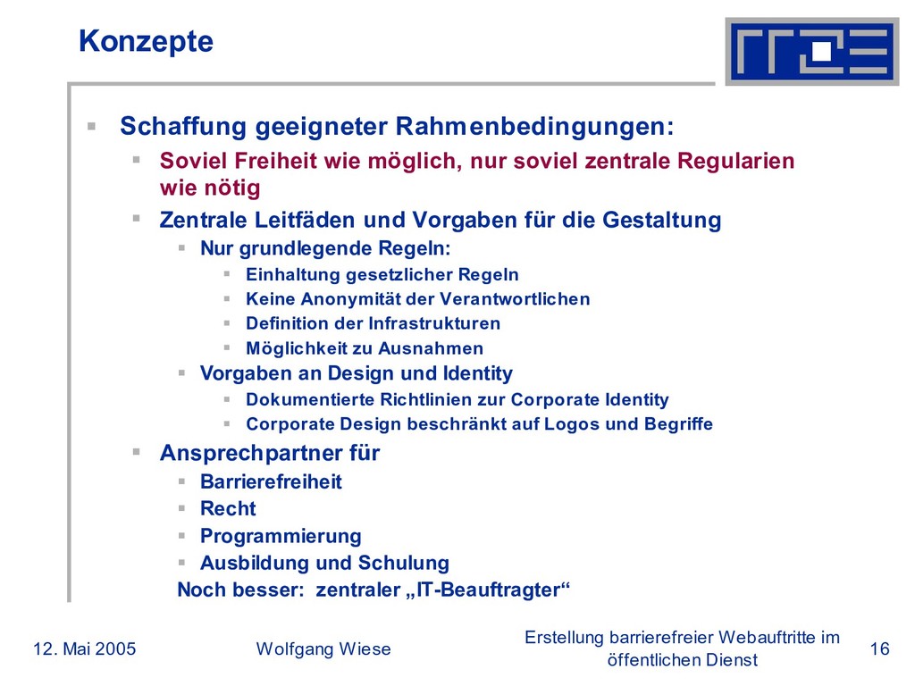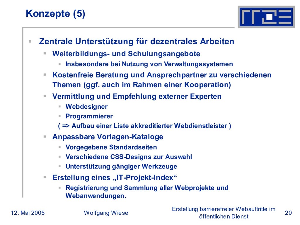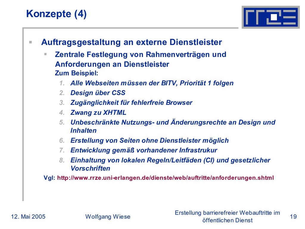 öffentlichen Dienst Konzepte (4) Auftragsgestaltung an externe Dienstleister Zentrale Festlegung von Rahmenverträgen und Anforderungen an Dienstleister Zum Beispiel: 1. Alle Webseiten müssen der BITV, Priorität 1 folgen 2. Design über CSS 3. Zugänglichkeit für fehlerfreie Browser 4. Zwang zu XHTML 5. Unbeschränkte Nutzungs- und Änderungsrechte an Design und Inhalten 6. Erstellung von Seiten ohne Dienstleister möglich 7. Entwicklung gemäß vorhandener Infrastrukur 8. Einhaltung von lokalen Regeln/Leitfäden (CI) und gesetzlicher Vorschriften Vgl: http://www.rrze.uni-erlangen.de/dienste/web/auftritte/anforderungen.shtml