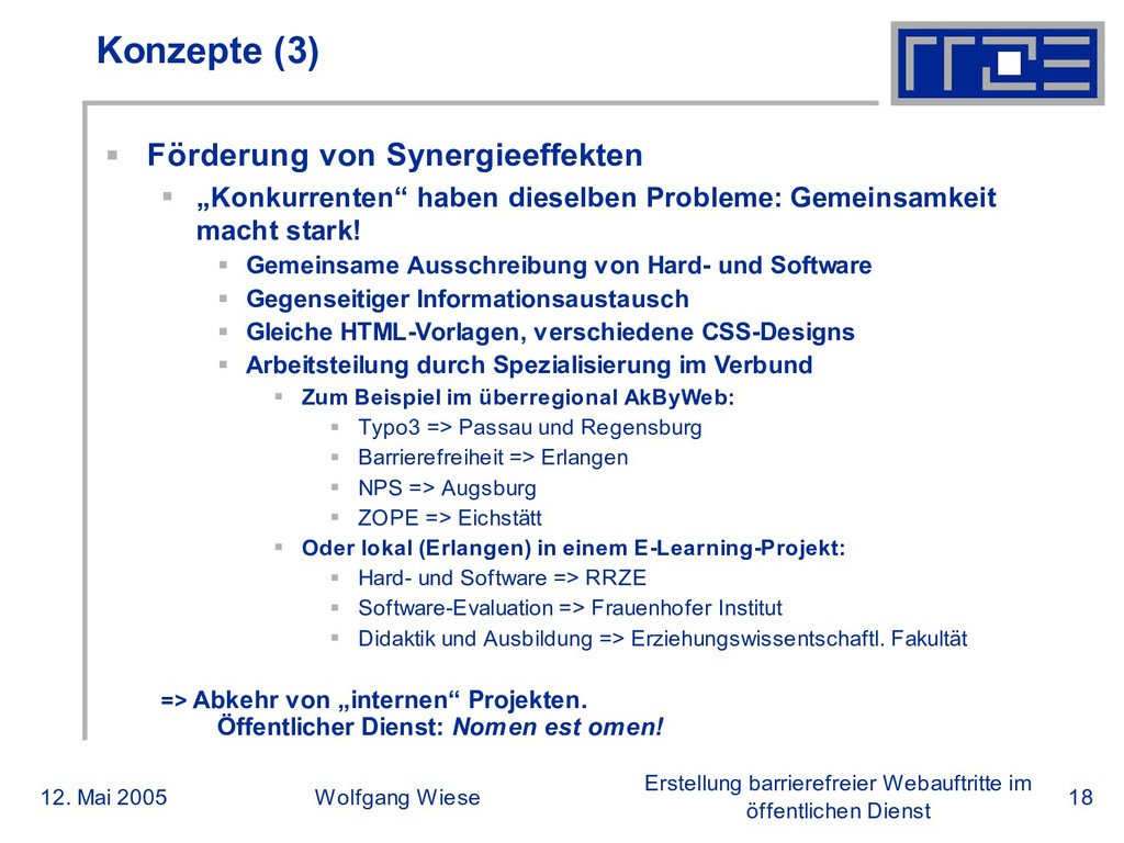 öffentlichen Dienst Konzepte (3) Förderung von Synergieeffekten „Konkurrenten“ haben dieselben Probleme: Gemeinsamkeit macht stark! Gemeinsame Ausschreibung von Hard- und Software Gegenseitiger Informationsaustausch Gleiche HTML-Vorlagen, verschiedene CSS-Designs Arbeitsteilung durch Spezialisierung im Verbund Zum Beispiel im überregional AkByWeb: Typo3 => Passau und Regensburg Barrierefreiheit => Erlangen NPS => Augsburg ZOPE => Eichstätt Oder lokal (Erlangen) in einem E-Learning-Projekt: Hard- und Software => RRZE Software-Evaluation => Frauenhofer Institut Didaktik und Ausbildung => Erziehungswissentschaftl. Fakultät => Abkehr von „internen“ Projekten. Öffentlicher Dienst: Nomen est omen!