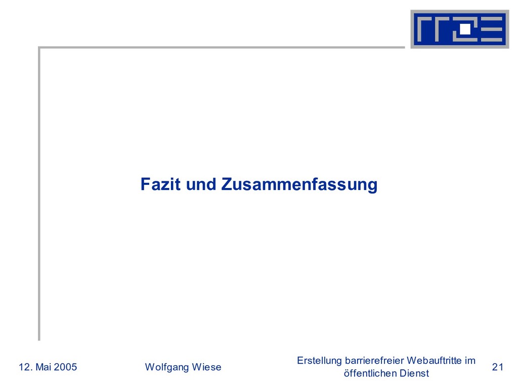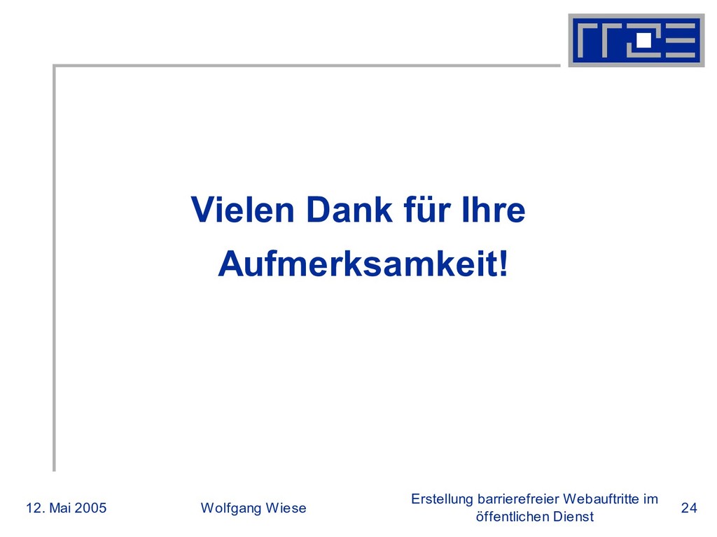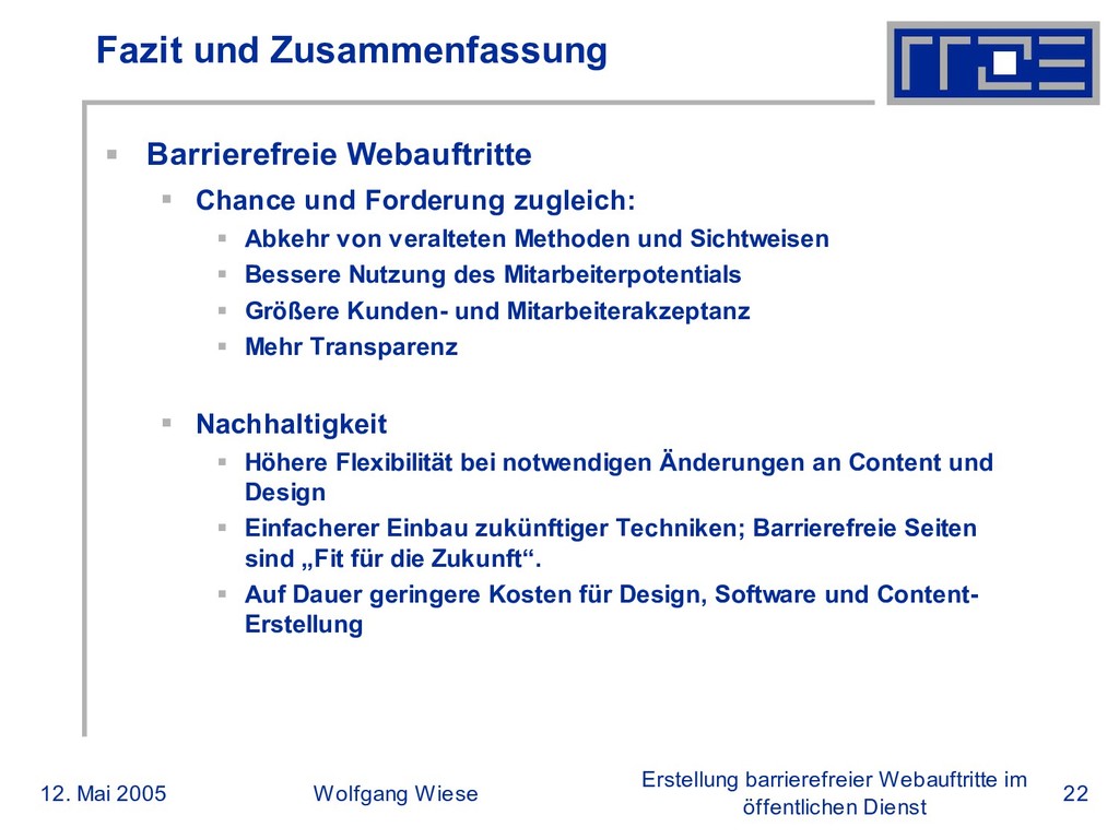 öffentlichen Dienst Fazit und Zusammenfassung Barrierefreie Webauftritte Chance und Forderung zugleich: Abkehr von veralteten Methoden und Sichtweisen Bessere Nutzung des Mitarbeiterpotentials Größere Kunden- und Mitarbeiterakzeptanz Mehr Transparenz Nachhaltigkeit Höhere Flexibilität bei notwendigen Änderungen an Content und Design Einfacherer Einbau zukünftiger Techniken; Barrierefreie Seiten sind „Fit für die Zukunft“. Auf Dauer geringere Kosten für Design, Software und Content- Erstellung