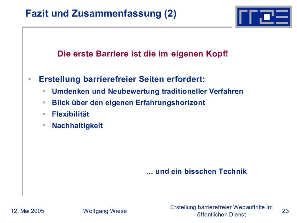 öffentlichen Dienst Fazit und Zusammenfassung (2) Die erste Barriere ist die im eigenen Kopf! Erstellung barrierefreier Seiten erfordert: Umdenken und Neubewertung traditioneller Verfahren Blick über den eigenen Erfahrungshorizont Flexibilität Nachhaltigkeit ... und ein bisschen Technik