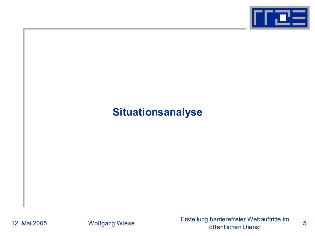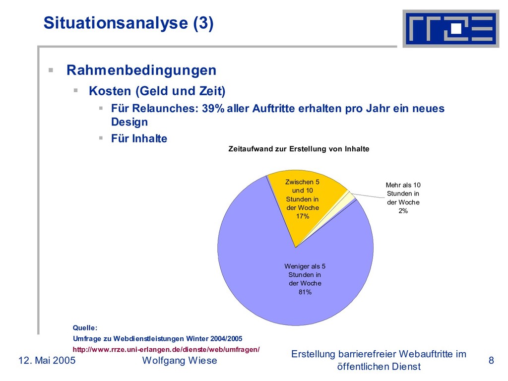 öffentlichen Dienst Situationsanalyse (3) Rahmenbedingungen Kosten (Geld und Zeit) Für Relaunches: 39% aller Auftritte erhalten pro Jahr ein neues Design Für Inhalte Quelle: Umfrage zu Webdienstleistungen Winter 2004/2005 http://www.rrze.uni-erlangen.de/dienste/web/umfragen/ Zeitaufwand zur Erstellung von Inhalte Mehr als 10 Stunden in der Woche 2% Zwischen 5 und 10 Stunden in der Woche 17% Weniger als 5 Stunden in der Woche 81%