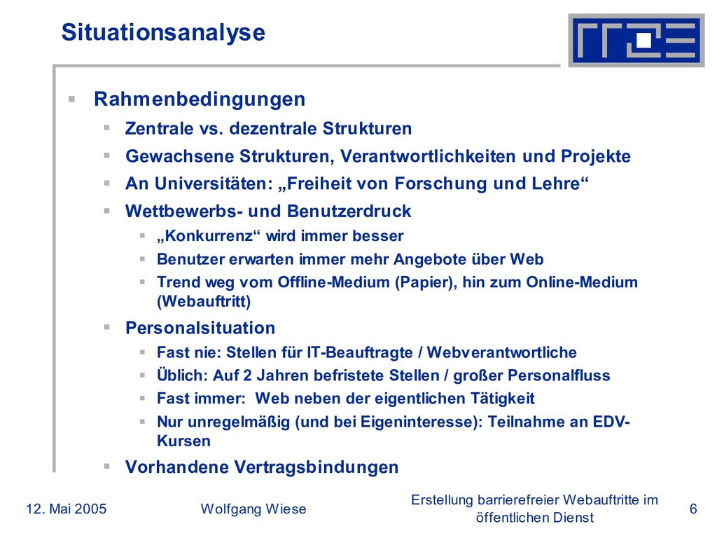 öffentlichen Dienst Situationsanalyse Rahmenbedingungen Zentrale vs. dezentrale Strukturen Gewachsene Strukturen, Verantwortlichkeiten und Projekte An Universitäten: „Freiheit von Forschung und Lehre“ Wettbewerbs- und Benutzerdruck „Konkurrenz“ wird immer besser Benutzer erwarten immer mehr Angebote über Web Trend weg vom Offline-Medium (Papier), hin zum Online-Medium (Webauftritt) Personalsituation Fast nie: Stellen für IT-Beauftragte / Webverantwortliche Üblich: Auf 2 Jahren befristete Stellen / großer Personalfluss Fast immer: Web neben der eigentlichen Tätigkeit Nur unregelmäßig (und bei Eigeninteresse): Teilnahme an EDV- Kursen Vorhandene Vertragsbindungen