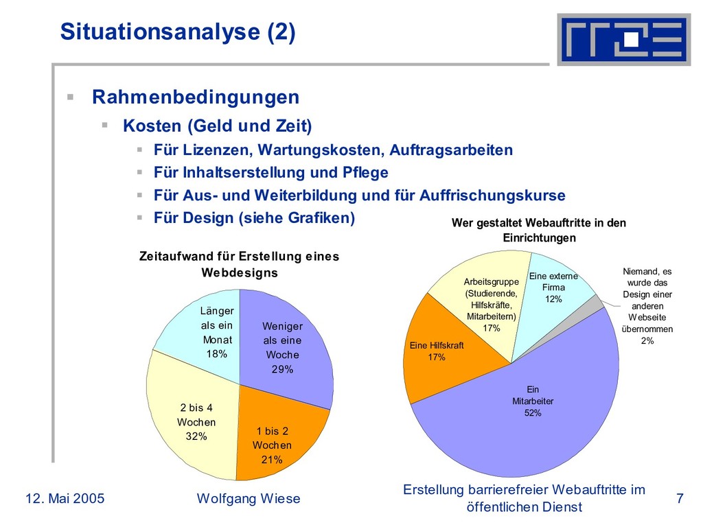 öffentlichen Dienst Situationsanalyse (2) Rahmenbedingungen Kosten (Geld und Zeit) Für Lizenzen, Wartungskosten, Auftragsarbeiten Für Inhaltserstellung und Pflege Für Aus- und Weiterbildung und für Auffrischungskurse Für Design (siehe Grafiken) Zeitaufwand für Erstellung eines Webdesigns 1 bis 2 Wochen 21% 2 bis 4 Wochen 32% Länger als ein Monat 18% Weniger als eine Woche 29% Wer gestaltet Webauftritte in den Einrichtungen Ein Mitarbeiter 52% Eine Hilfskraft 17% Arbeitsgruppe (Studierende, Hilfskräfte, Mitarbeitern) 17% Eine externe Firma 12% Niemand, es wurde das Design einer anderen Webseite übernommen 2%