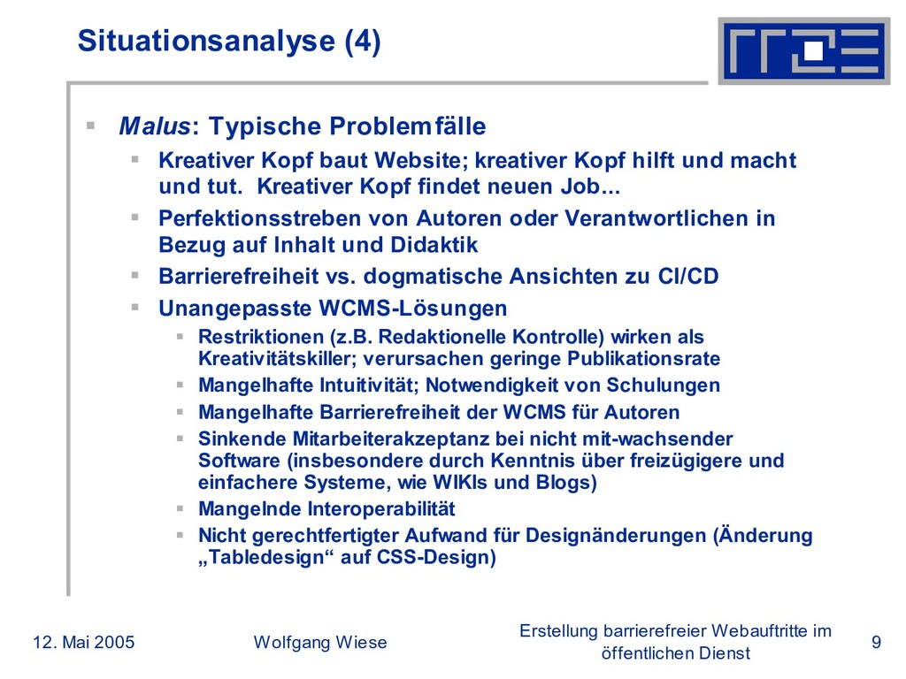 öffentlichen Dienst Situationsanalyse (4) Malus: Typische Problemfälle Kreativer Kopf baut Website; kreativer Kopf hilft und macht und tut. Kreativer Kopf findet neuen Job... Perfektionsstreben von Autoren oder Verantwortlichen in Bezug auf Inhalt und Didaktik Barrierefreiheit vs. dogmatische Ansichten zu CI/CD Unangepasste WCMS-Lösungen Restriktionen (z.B. Redaktionelle Kontrolle) wirken als Kreativitätskiller; verursachen geringe Publikationsrate Mangelhafte Intuitivität; Notwendigkeit von Schulungen Mangelhafte Barrierefreiheit der WCMS für Autoren Sinkende Mitarbeiterakzeptanz bei nicht mit-wachsender Software (insbesondere durch Kenntnis über freizügigere und einfachere Systeme, wie WIKIs und Blogs) Mangelnde Interoperabilität Nicht gerechtfertigter Aufwand für Designänderungen (Änderung „Tabledesign“ auf CSS-Design)