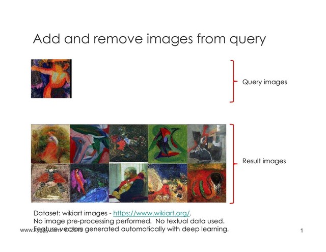 images Dataset: wikiart images - https://www.wikiart.org/. No image pre-processing performed. No textual data used. Feature vectors generated automatically with deep learning. www.xyggy.com © 2019