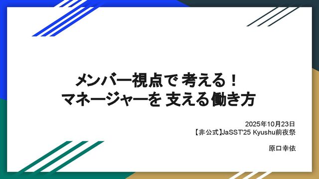 メンバー視点で 考える! マネージャーを 支える 働き方 2025年10月23日 【非公式】JaSST'25 Kyushu前夜祭 原口幸依