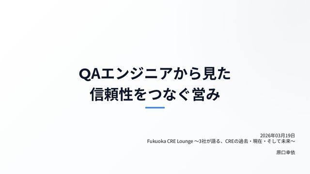 QAエンジニアから⾒た 信頼性をつなぐ営み 2026年03⽉19⽇ Fukuoka CRE Lounge 〜3社が語る、CREの過去‧現在‧そして未来〜 原⼝幸依