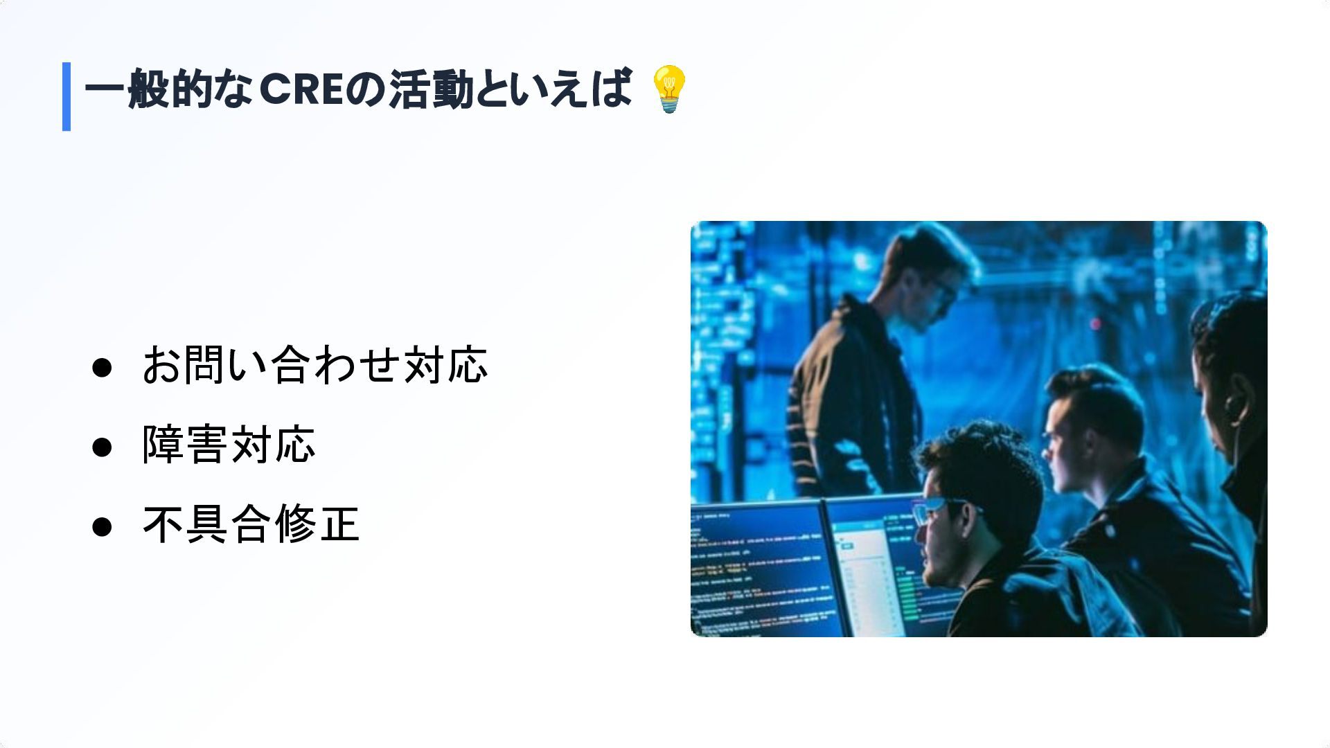 一般的なCREの活動といえば 💡 • お問い合わせ対応 • 障害対応 • 不具合修正