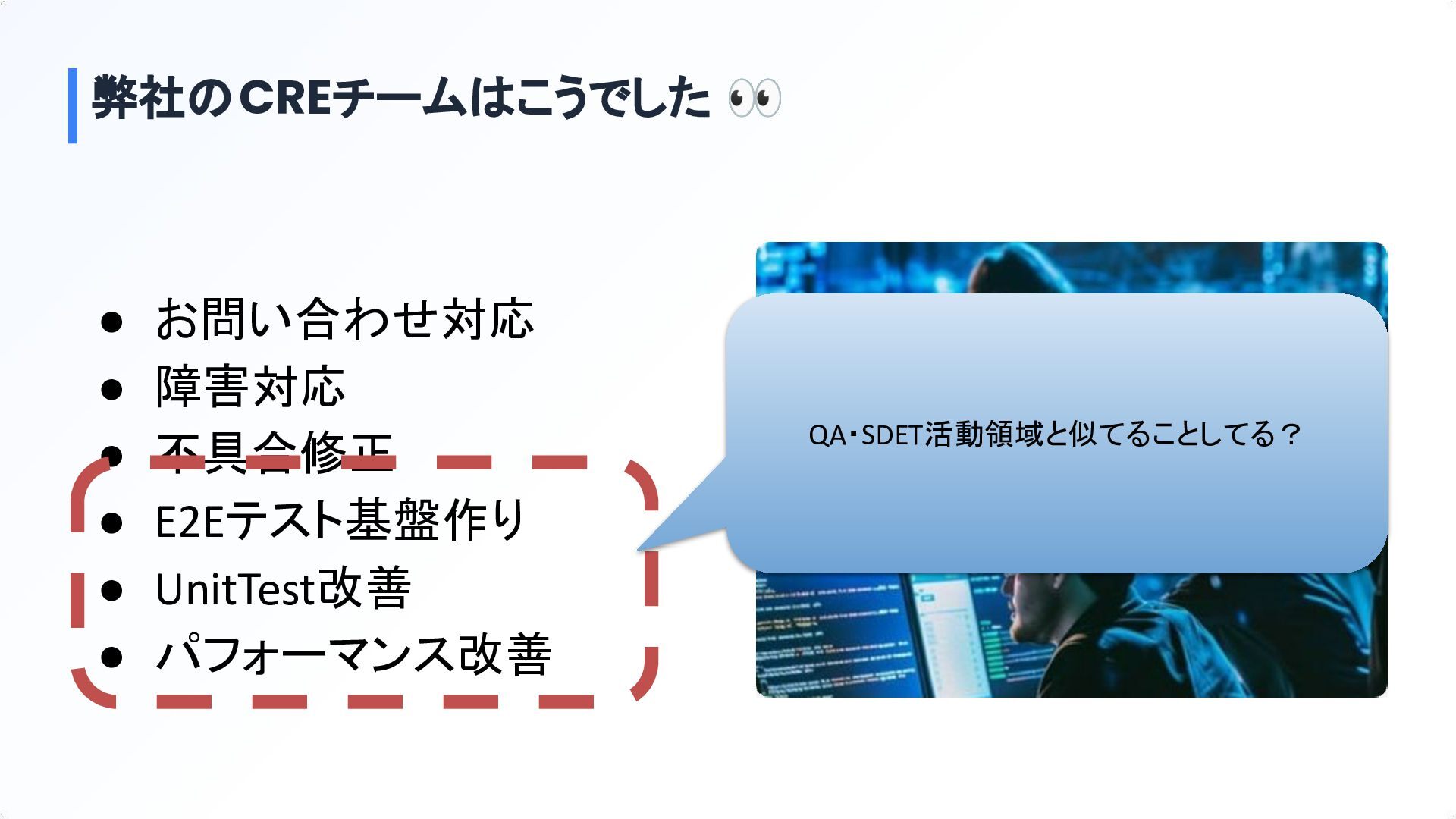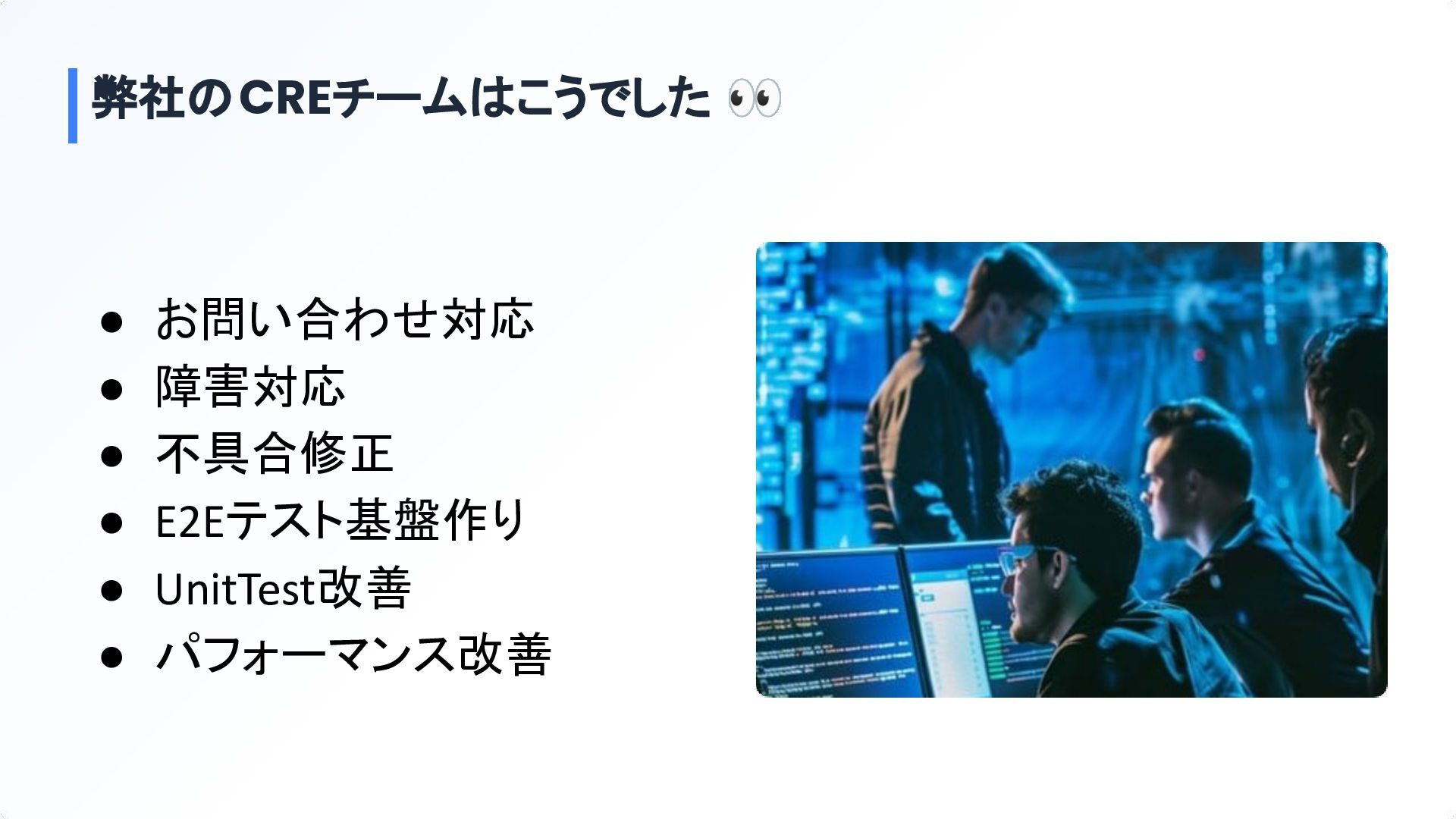 弊社のCREチームはこうでした 👀 • お問い合わせ対応 • 障害対応 • 不具合修正 • E2Eテスト基盤作り