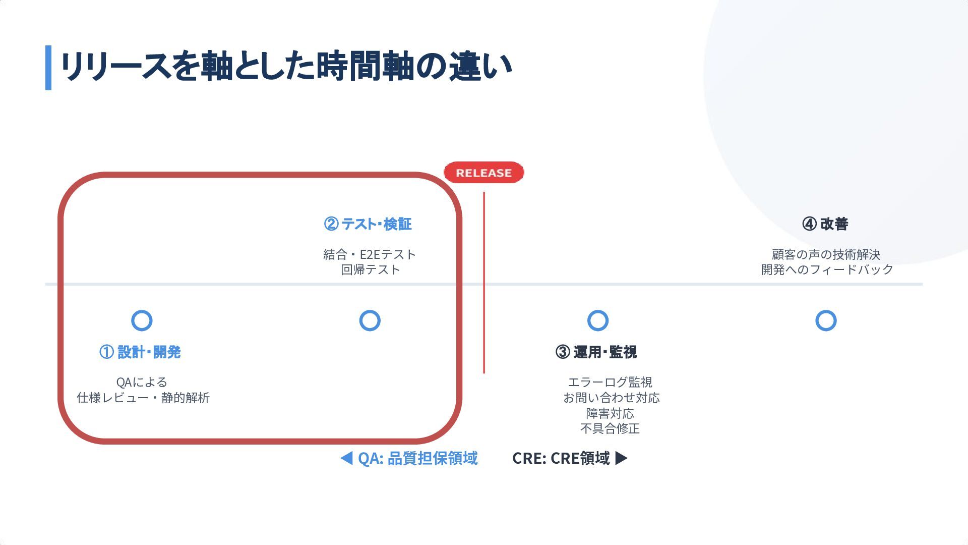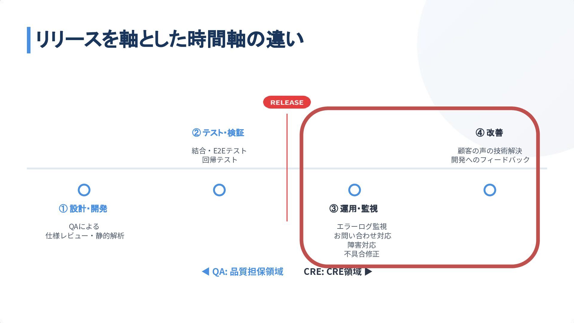 ② テスト・検証 結合‧E2Eテスト 回帰テスト ③ 運用・監視 エラーログ監視 お問い合わせ対応 障害対応 不具合修正 ④ 改善 顧客の声の技術解決 開発へのフィードバック リリースを軸とした時間軸の違い