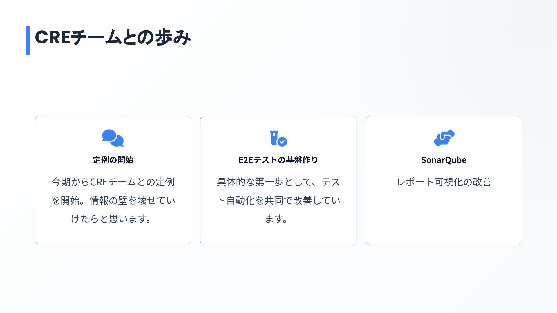定例の開始 今期からCREチームとの定例 を開始。情報の壁を壊せてい けたらと思います。 E2Eテストの基盤作り 具体的な第⼀歩として、テス ト⾃動化を共同で改善してい ます。 SonarQube レポート可視化の改善