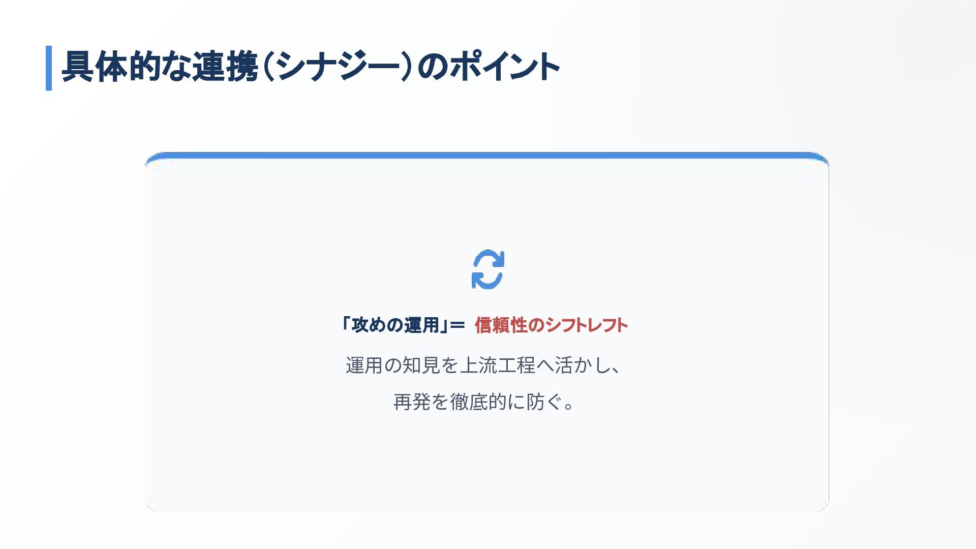 「攻めの運用」= 信頼性のシフトレフト 運⽤の知⾒を上流⼯程へ活かし、 再発を徹底的に防ぐ。 具体的な連携(シナジー)のポイント
