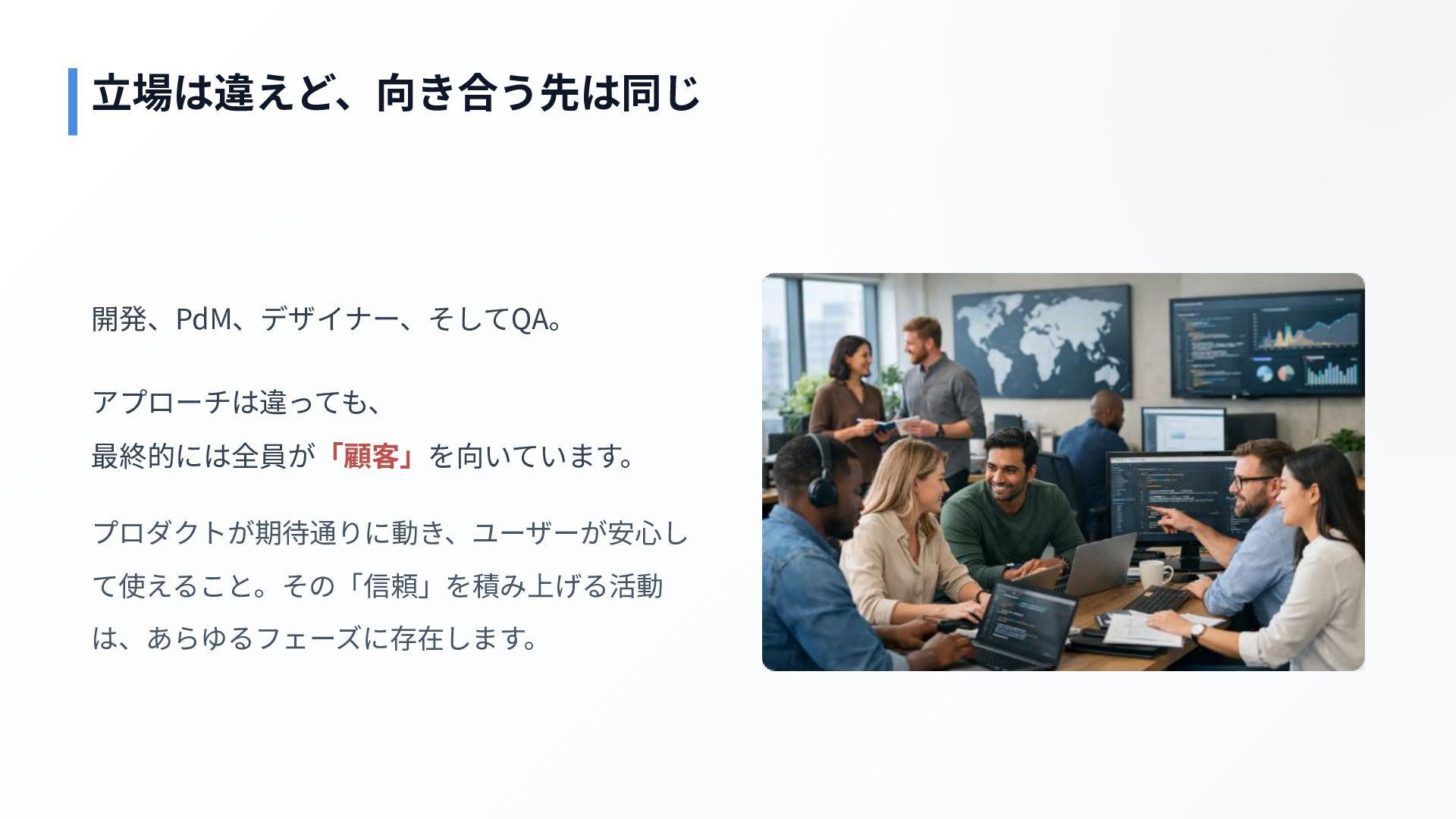 開発、PdM、デザイナー、そしてQA。 アプローチは違っても、 最終的には全員が「顧客」を向いています。 プロダクトが期待通りに動き、ユーザーが安⼼し て使えること。その「信頼」を積み上げる活動 は、あらゆるフェーズに存在します。 ⽴場は違えど、向き合う先は同じ