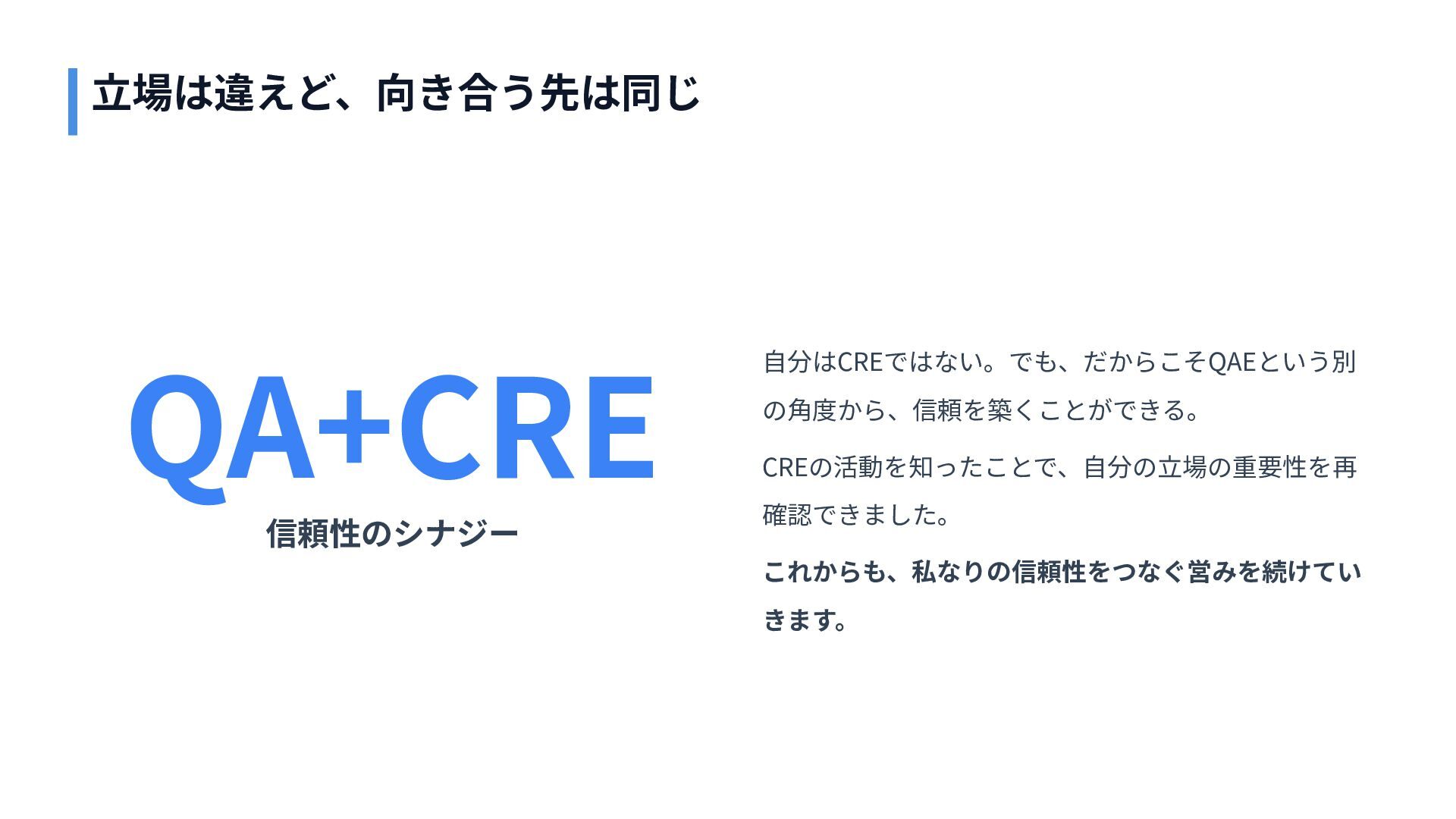 QA+CRE 信頼性のシナジー ⾃分はCREではない。でも、だからこそQAEという別 の⾓度から、信頼を築くことができる。 CREの活動を知ったことで、⾃分の⽴場の重要性を再 確認できました。 これからも、私なりの信頼性をつなぐ営みを続けてい きます。 ⽴場は違えど、向き合う先は同じ