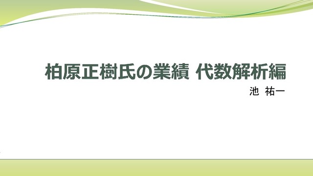 MATHPOWER2018での講演スライド。チャーン賞受賞の柏原正樹氏の代数解析における業績紹介。