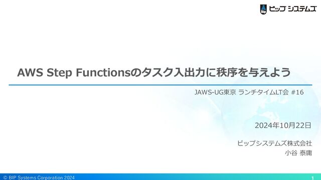 "Bucket": "jaws-demo-hakuhime", "Prefix": "processlog”, "StopDate": { "String": "2024/06/25", "Epoch": 1719241200 }, "ProcessingStep": 86400 }, "Status": { "CurrentProcessingTime": 1719154800 }, "Result": { "PlotDataObject": { "Bucket": "jaws-demo-hakuhime", "Key": "plotdata/20240624.plot" }, "GraphImageObject": { "Bucket": "jaws-demo-hakuhime", "Key": "graph/20240624.png" } } } ログが保存されているS3情報 処理終了日付 (ステートマシン起動日の前日) 処理単位(1日の秒数) 処理中の日付 プロットデータ抽出結果 グラフ作成結果 管理すべきデータを カテゴライズして秩序を保つ パラメータ情報 状態情報 処理結果情報 ステートマシンの処理特性に応じてカテゴリを考えましょう