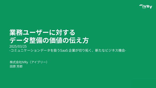 業務ユーザーに対する データ整備の価値の伝え⽅ 2025/03/25 -コミュニケーションデータを扱うSaaS 企業が切り拓く、新たなビジネス機会- 株式会社IVRy(アイブリー) ⽥原 芳郎
