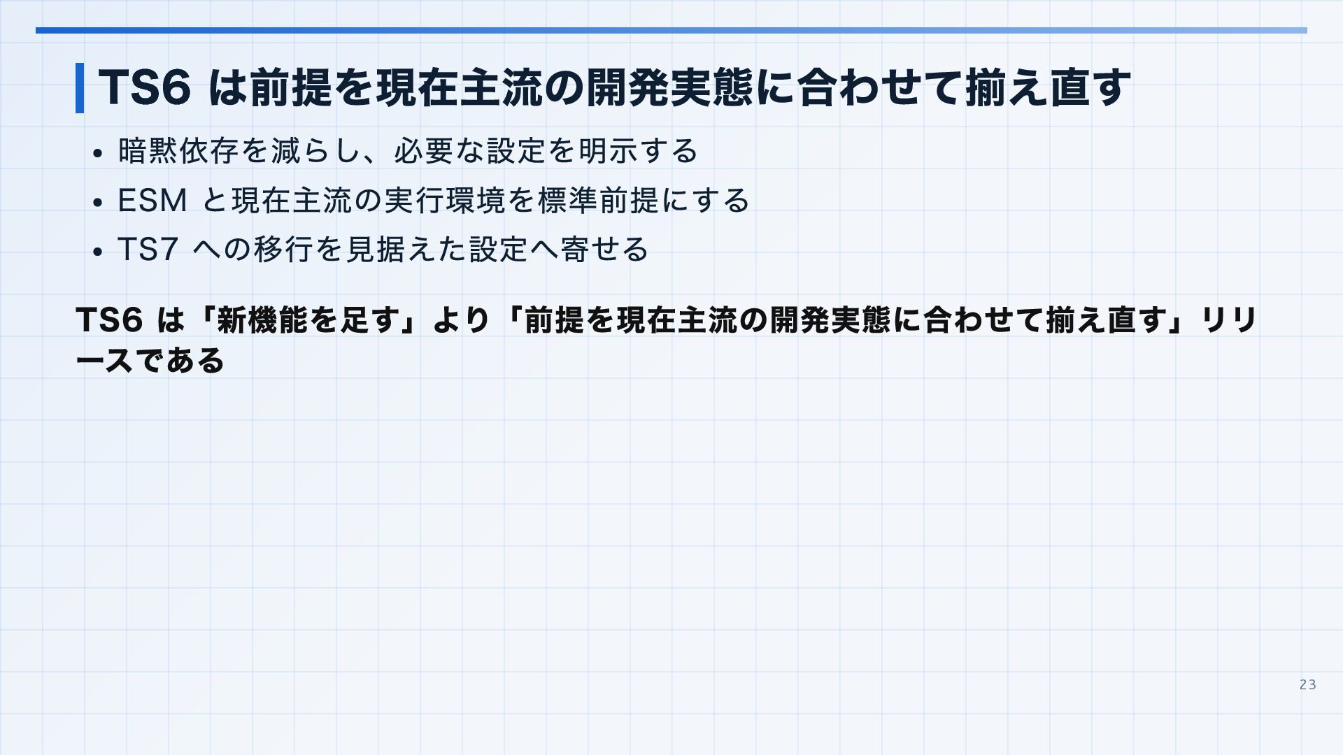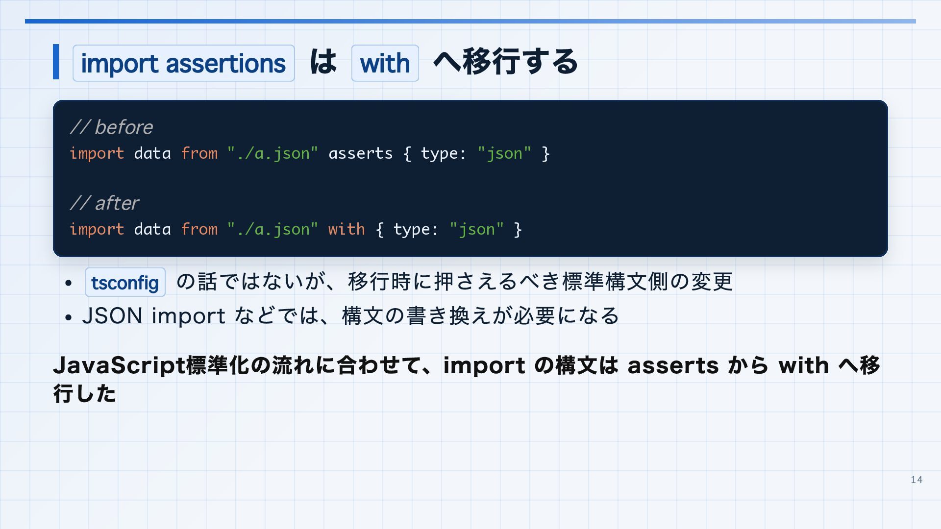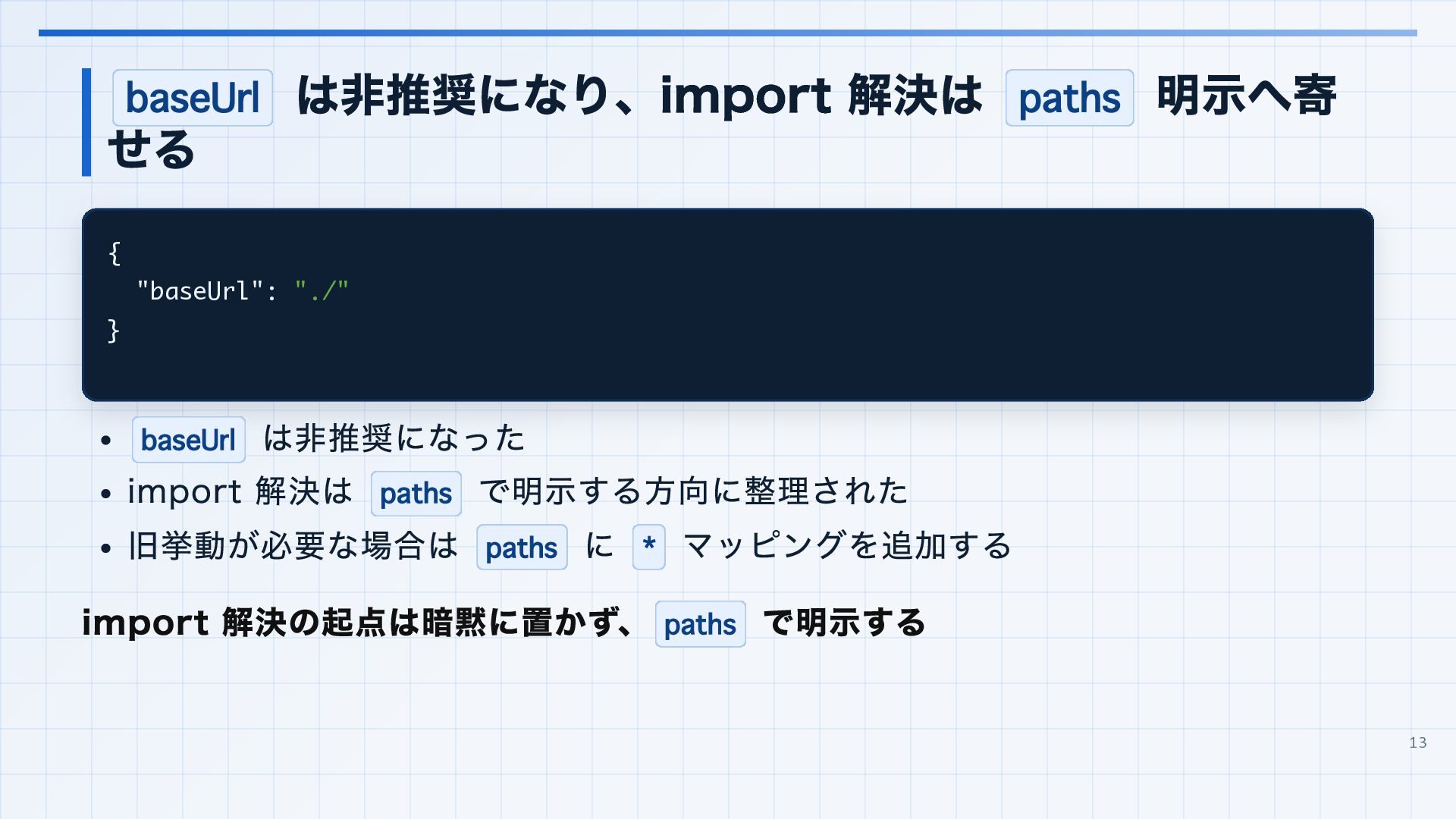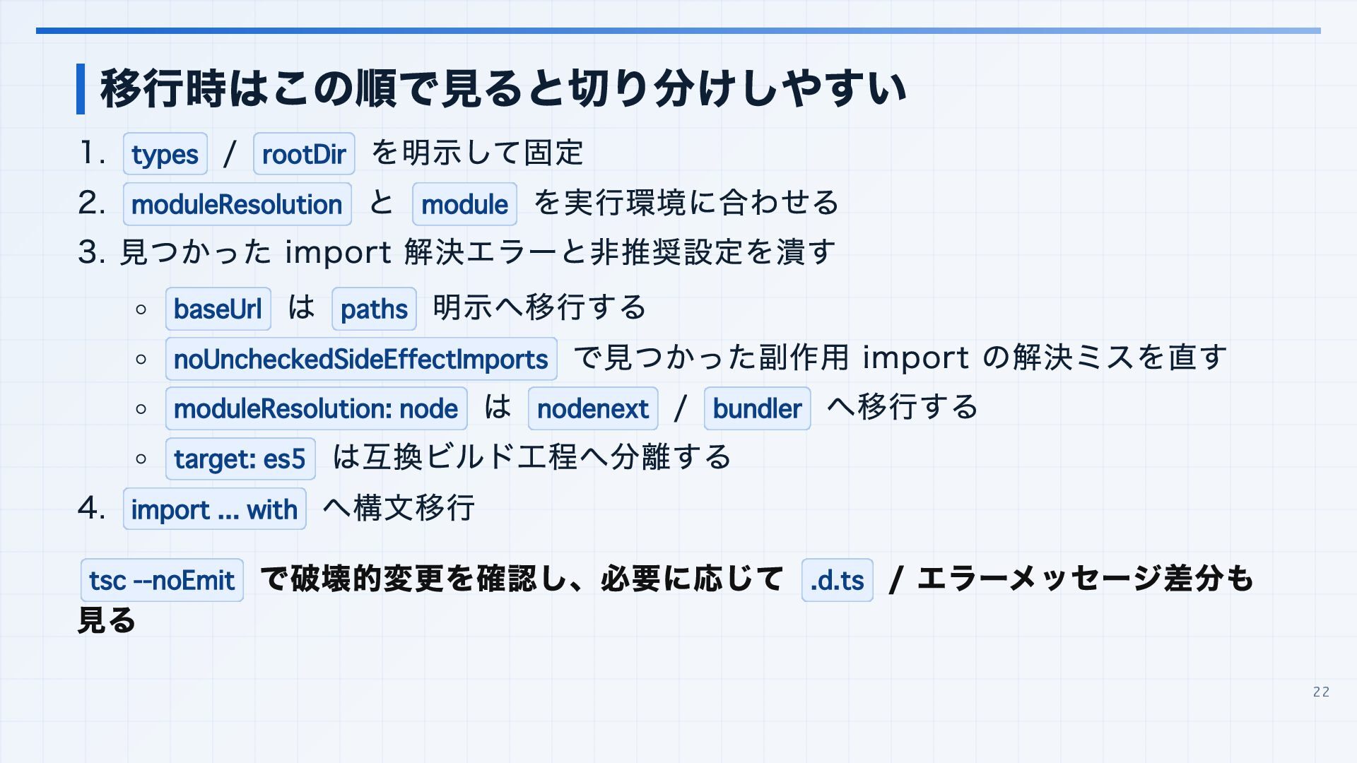 を実行環境に合わせる 3. 見つかった import 解決エラーと非推奨設定を潰す baseUrl は paths 明示へ移行する noUncheckedSideEffectImports で見つかった副作用 import の解決ミスを直す moduleResolution: node は nodenext / bundler へ移行する target: es5 は互換ビルド工程へ分離する 4. import ... with へ構文移行 tsc --noEmit で破壊的変更を確認し、必要に応じて .d.ts / エラーメッセージ差分も 見る 22