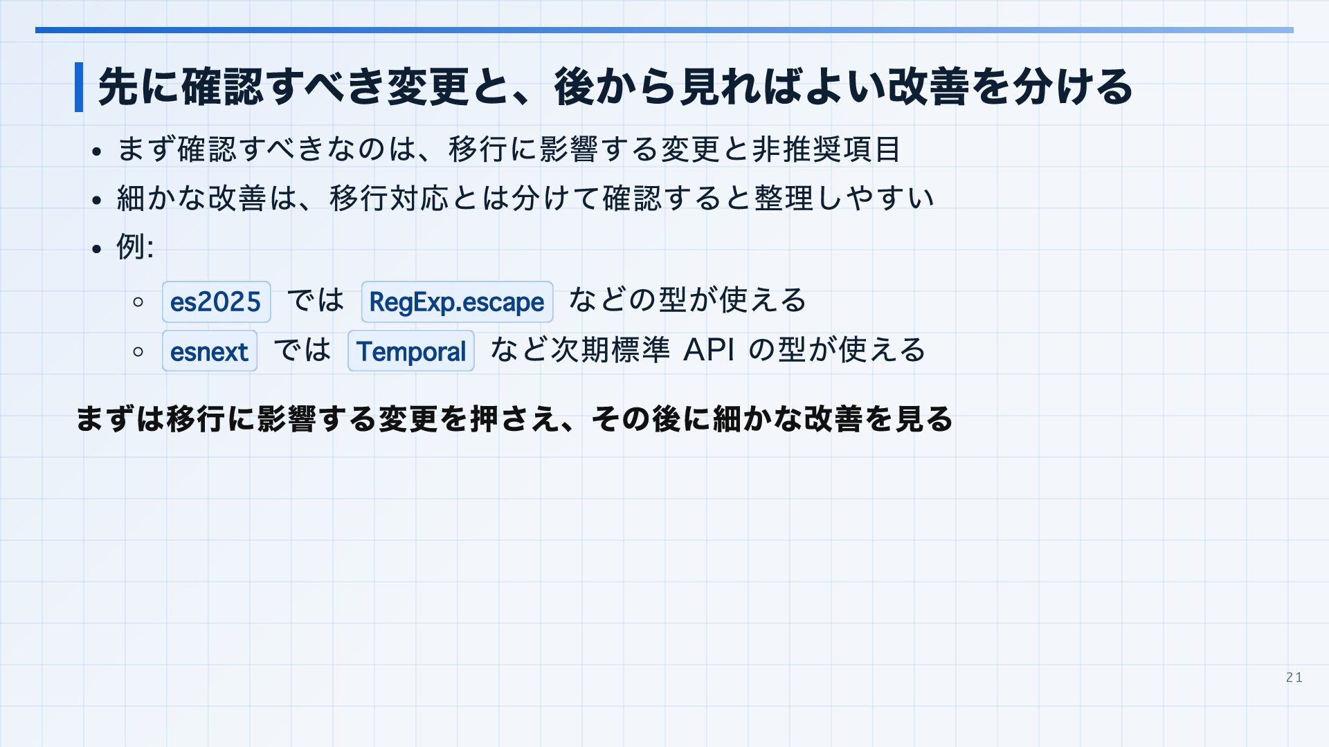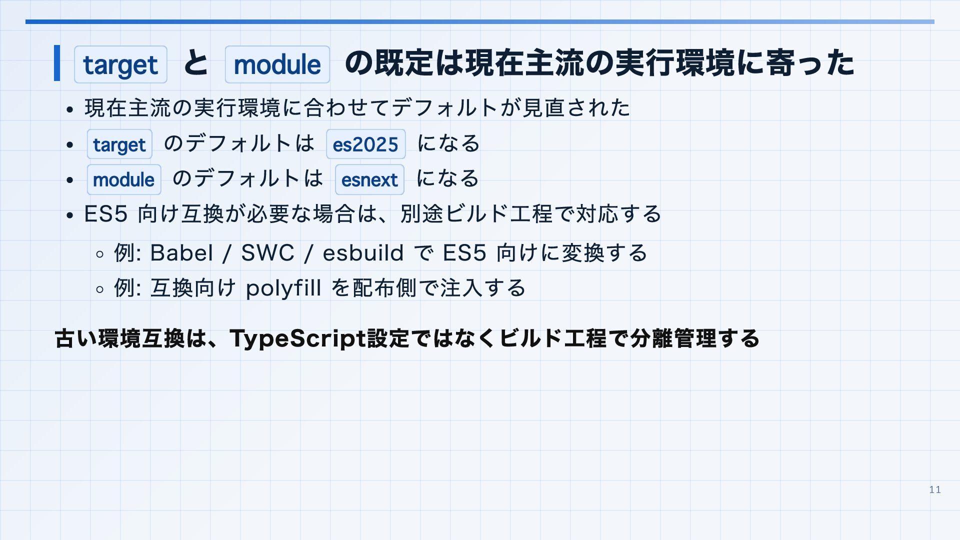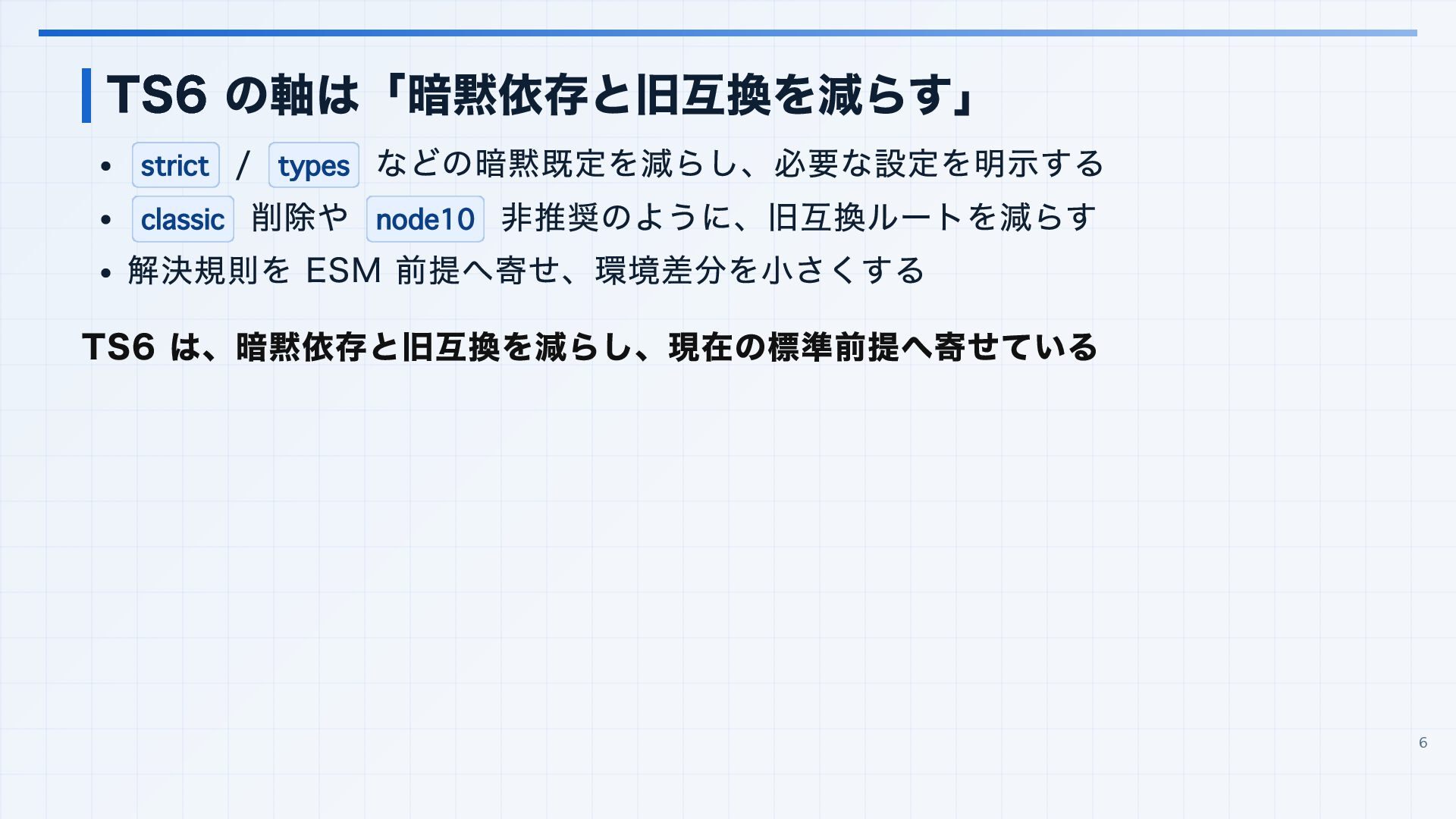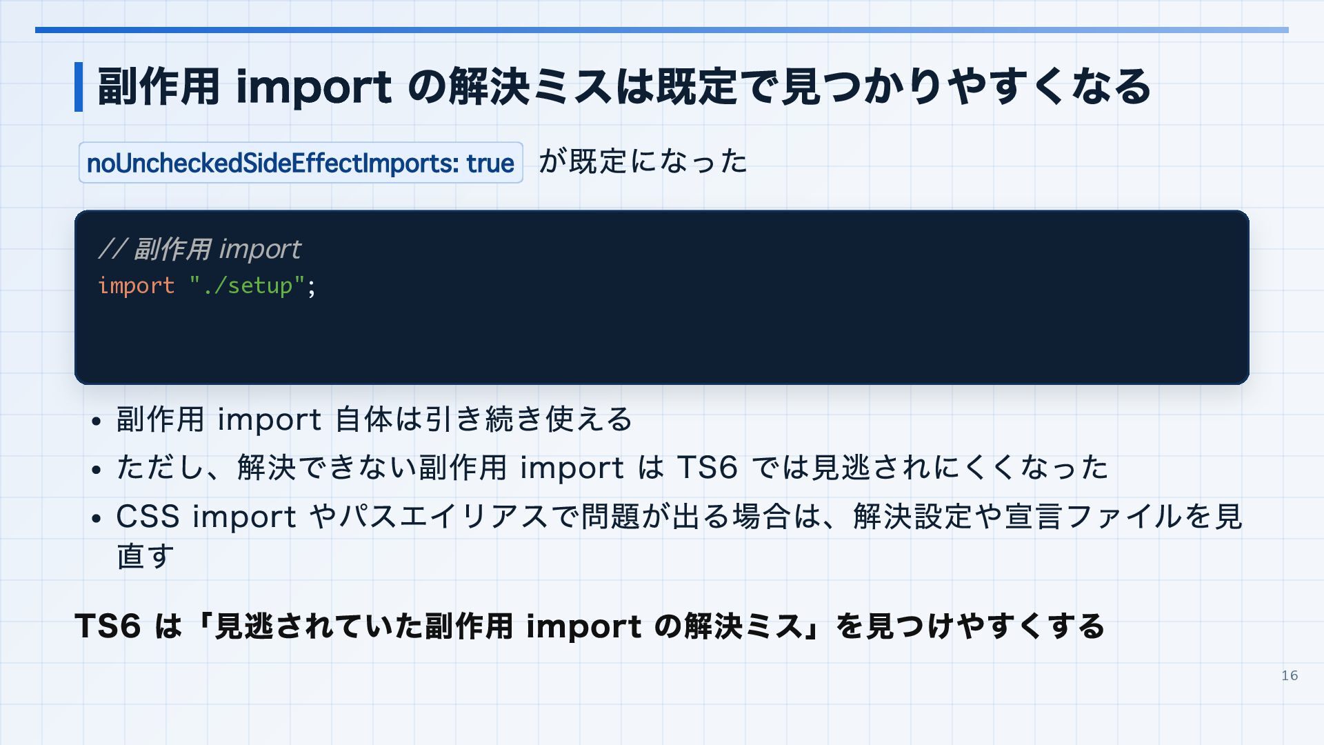 を実行環境に合わせる 3. 見つかった import 解決エラーと非推奨設定を潰す baseUrl は paths 明示へ移行する noUncheckedSideEffectImports で見つかった副作用 import の解決ミスを直す moduleResolution: node は nodenext / bundler へ移行する target: es5 は互換ビルド工程へ分離する 4. import ... with へ構文移行 tsc --noEmit で破壊的変更を確認し、必要に応じて .d.ts / エラーメッセージ差分も 見る 22
