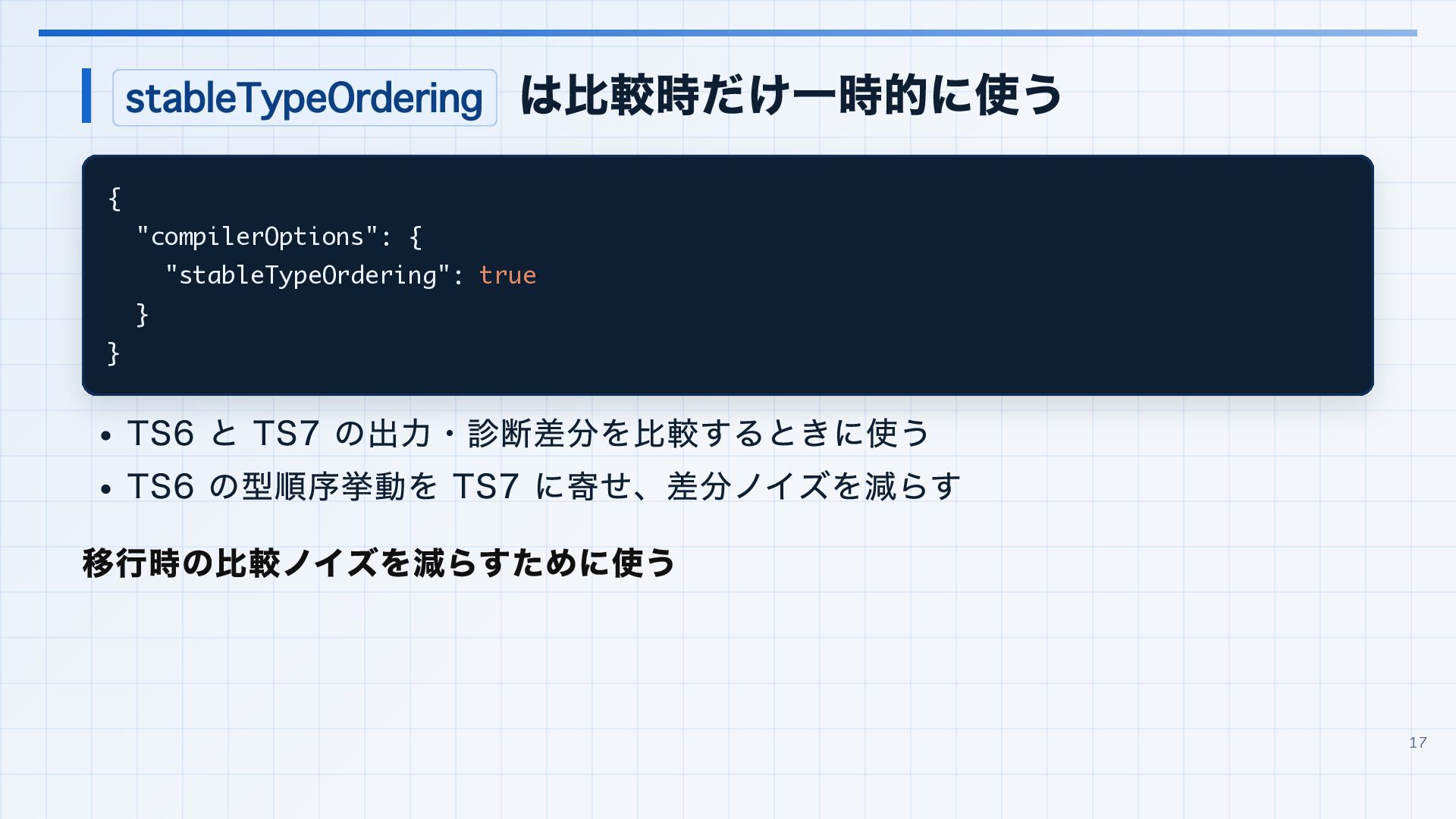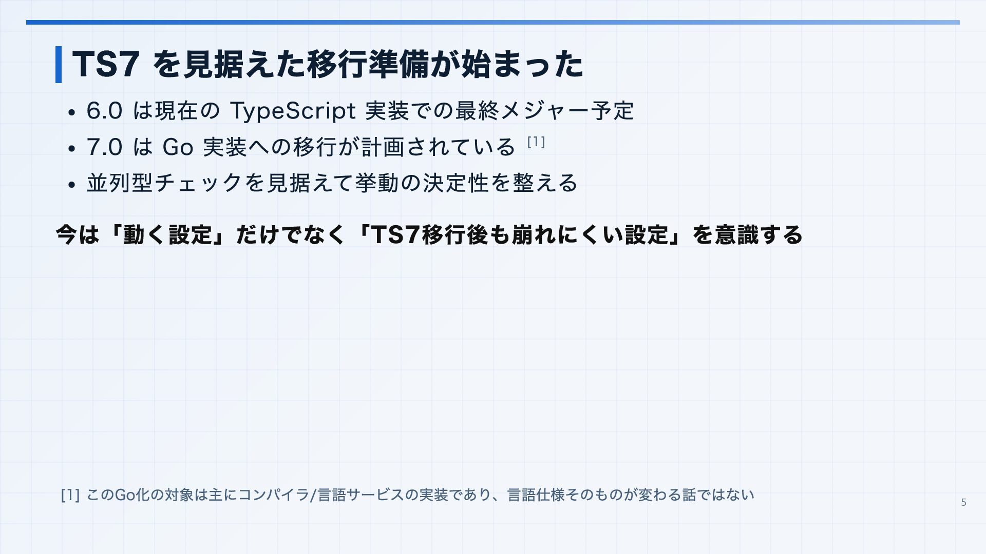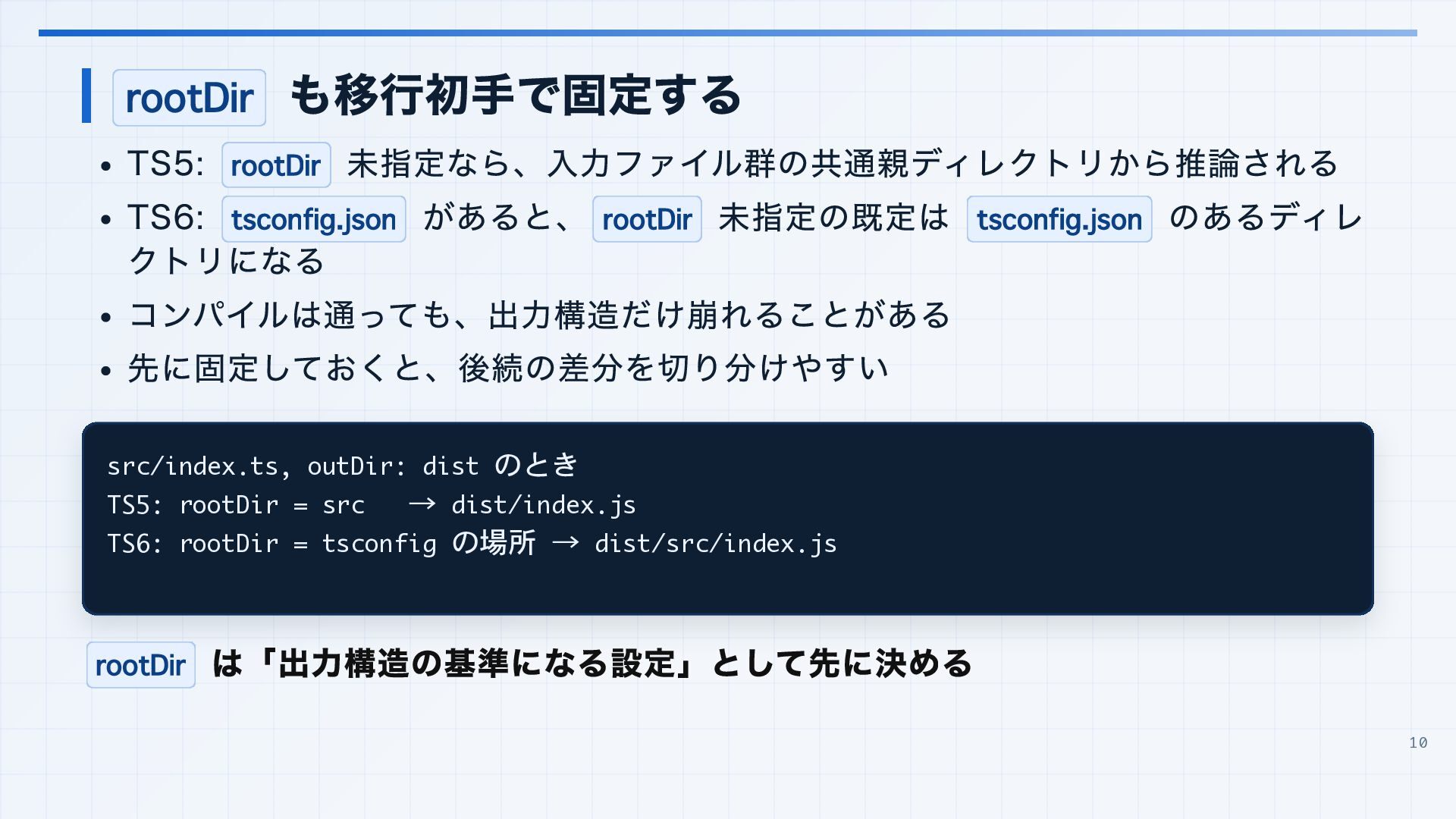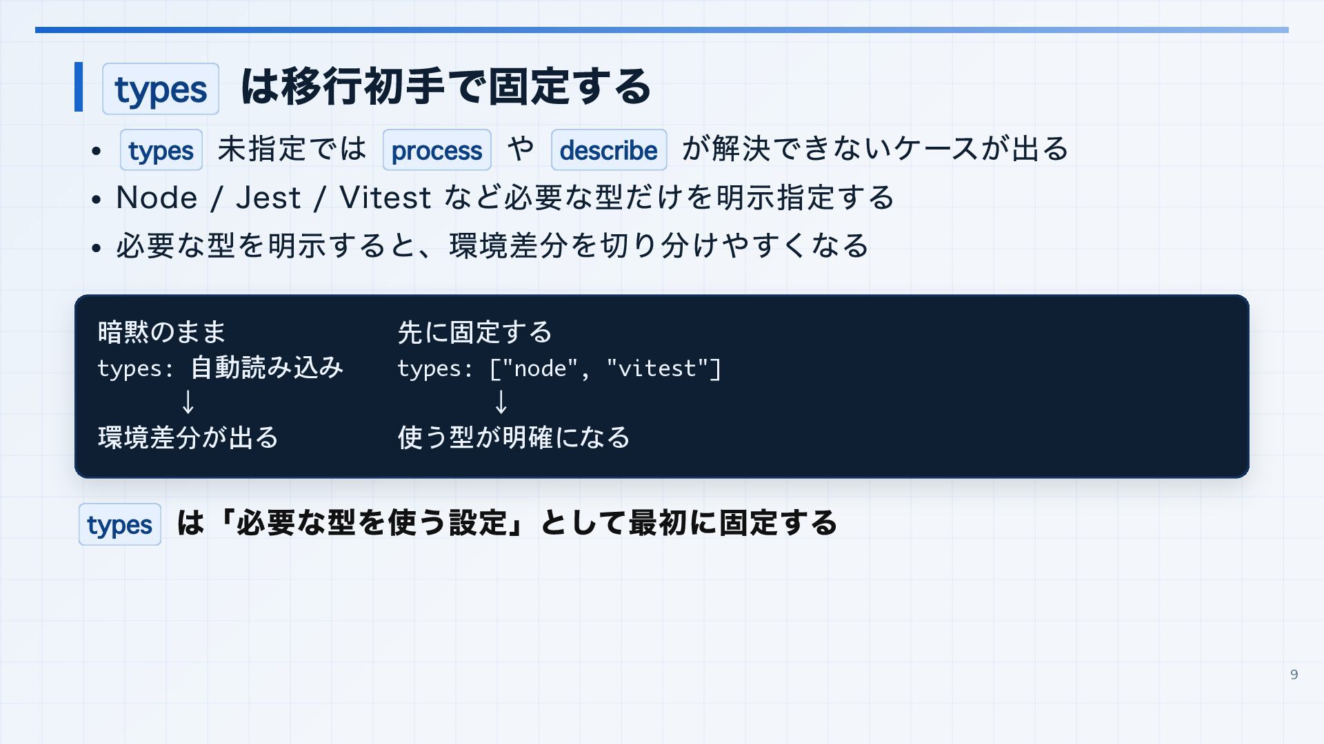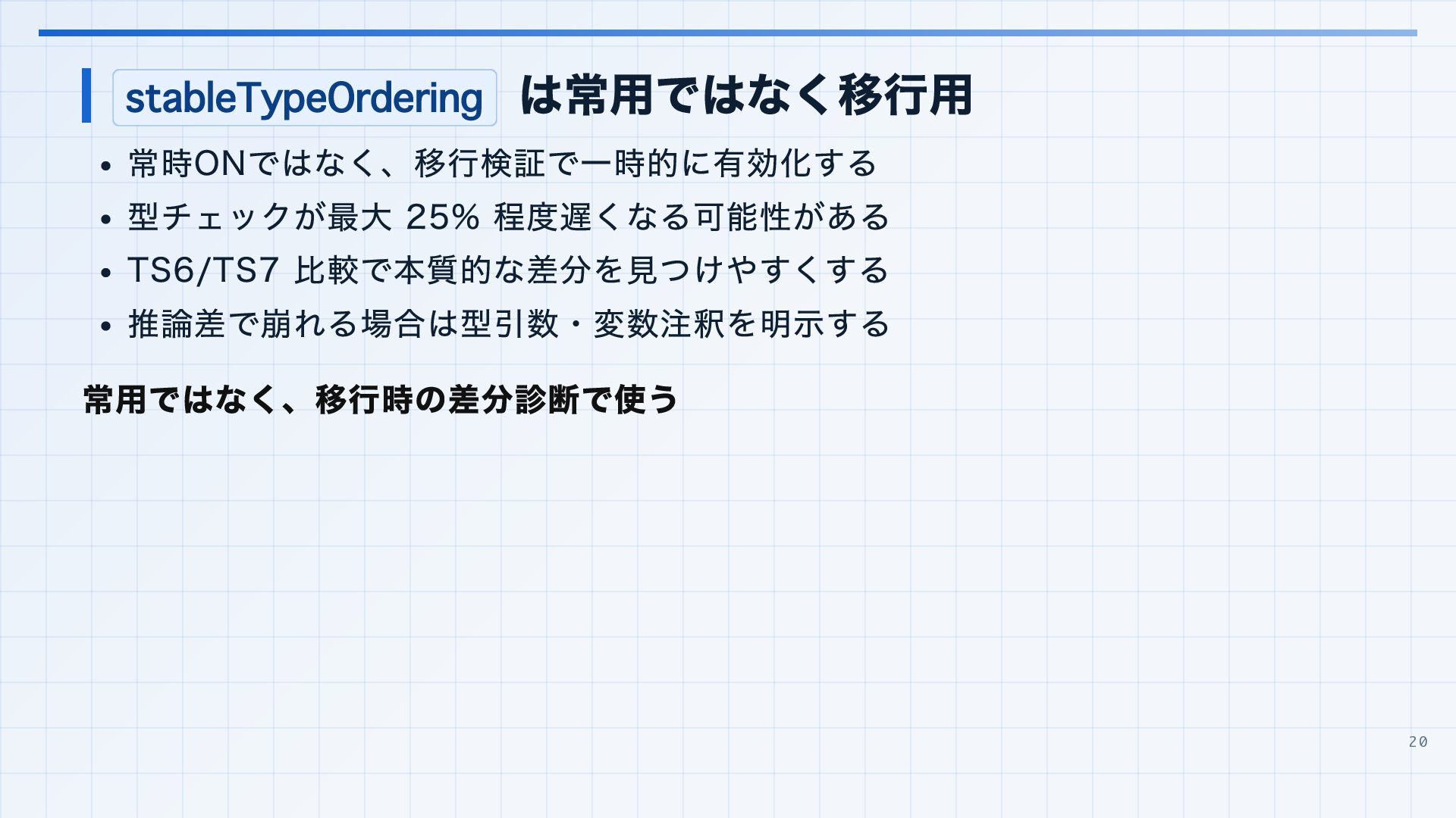を実行環境に合わせる 3. 見つかった import 解決エラーと非推奨設定を潰す baseUrl は paths 明示へ移行する noUncheckedSideEffectImports で見つかった副作用 import の解決ミスを直す moduleResolution: node は nodenext / bundler へ移行する target: es5 は互換ビルド工程へ分離する 4. import ... with へ構文移行 tsc --noEmit で破壊的変更を確認し、必要に応じて .d.ts / エラーメッセージ差分も 見る 22