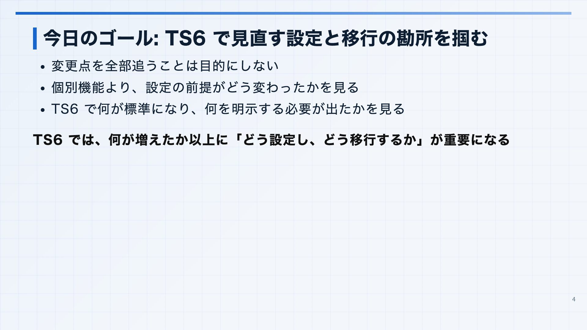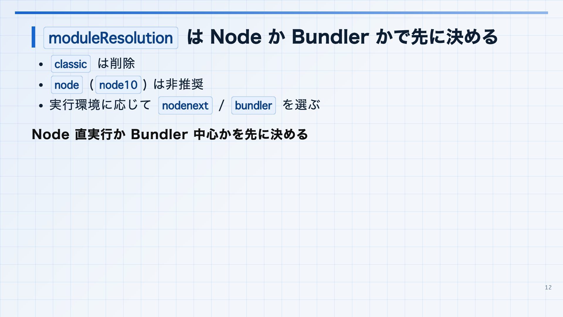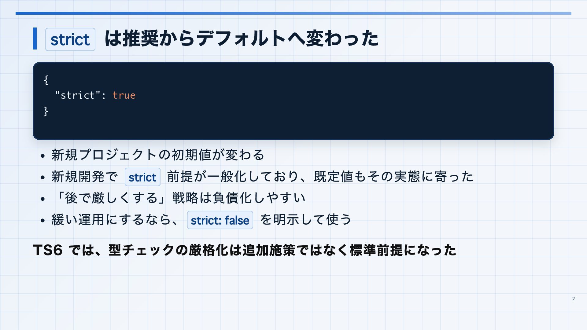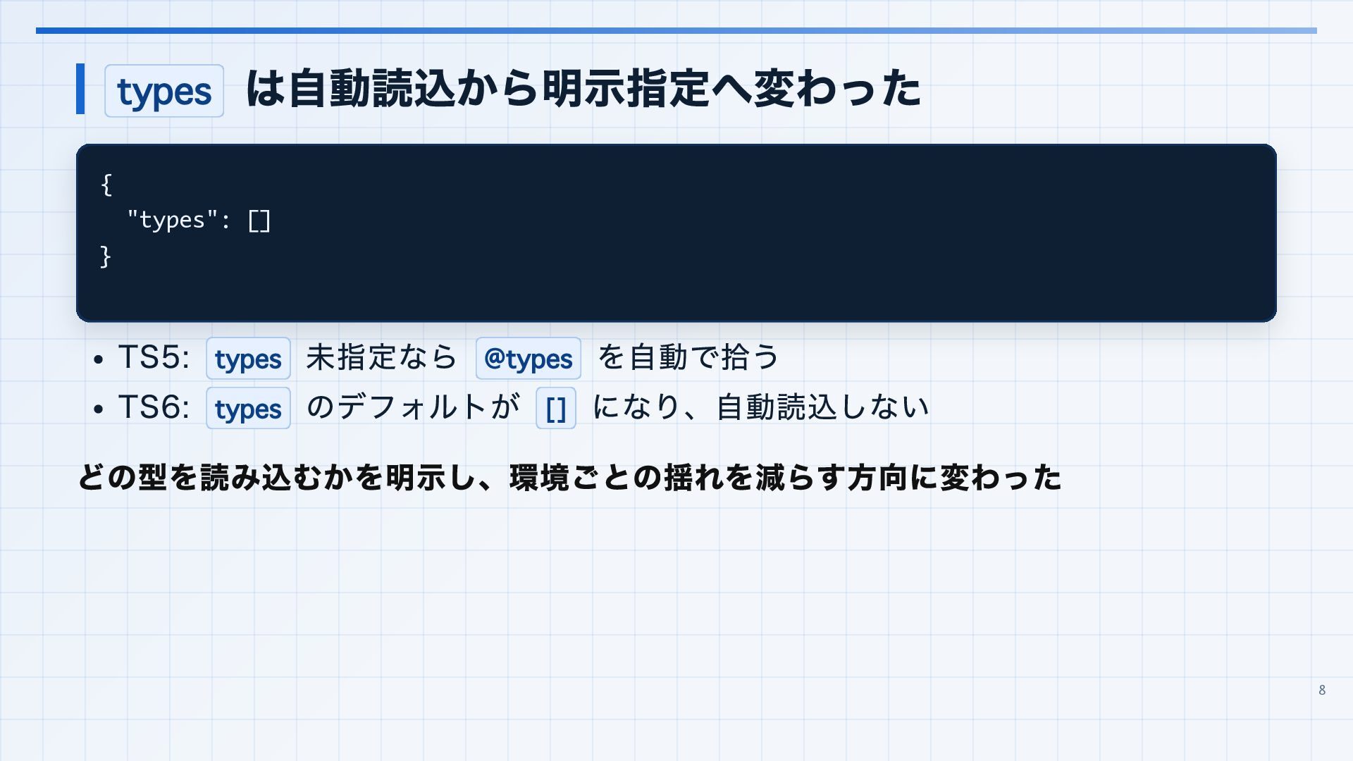 を実行環境に合わせる 3. 見つかった import 解決エラーと非推奨設定を潰す baseUrl は paths 明示へ移行する noUncheckedSideEffectImports で見つかった副作用 import の解決ミスを直す moduleResolution: node は nodenext / bundler へ移行する target: es5 は互換ビルド工程へ分離する 4. import ... with へ構文移行 tsc --noEmit で破壊的変更を確認し、必要に応じて .d.ts / エラーメッセージ差分も 見る 22