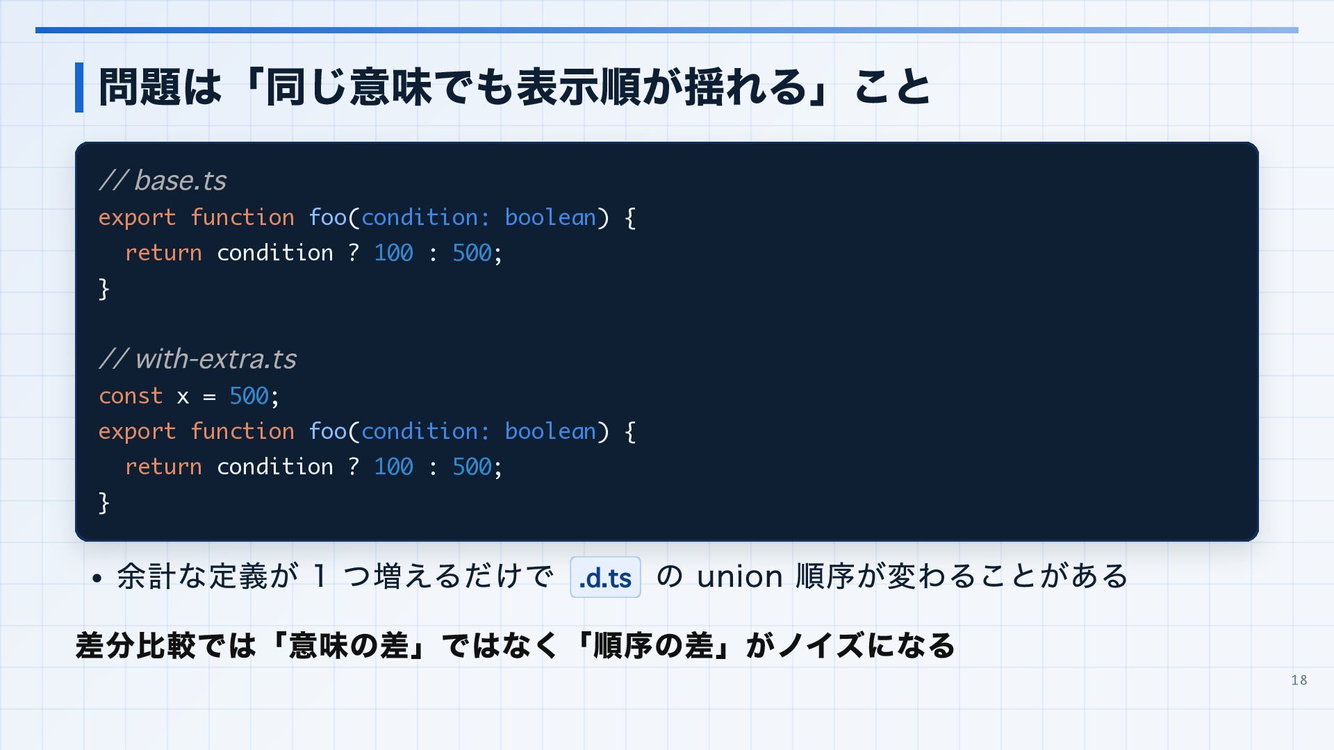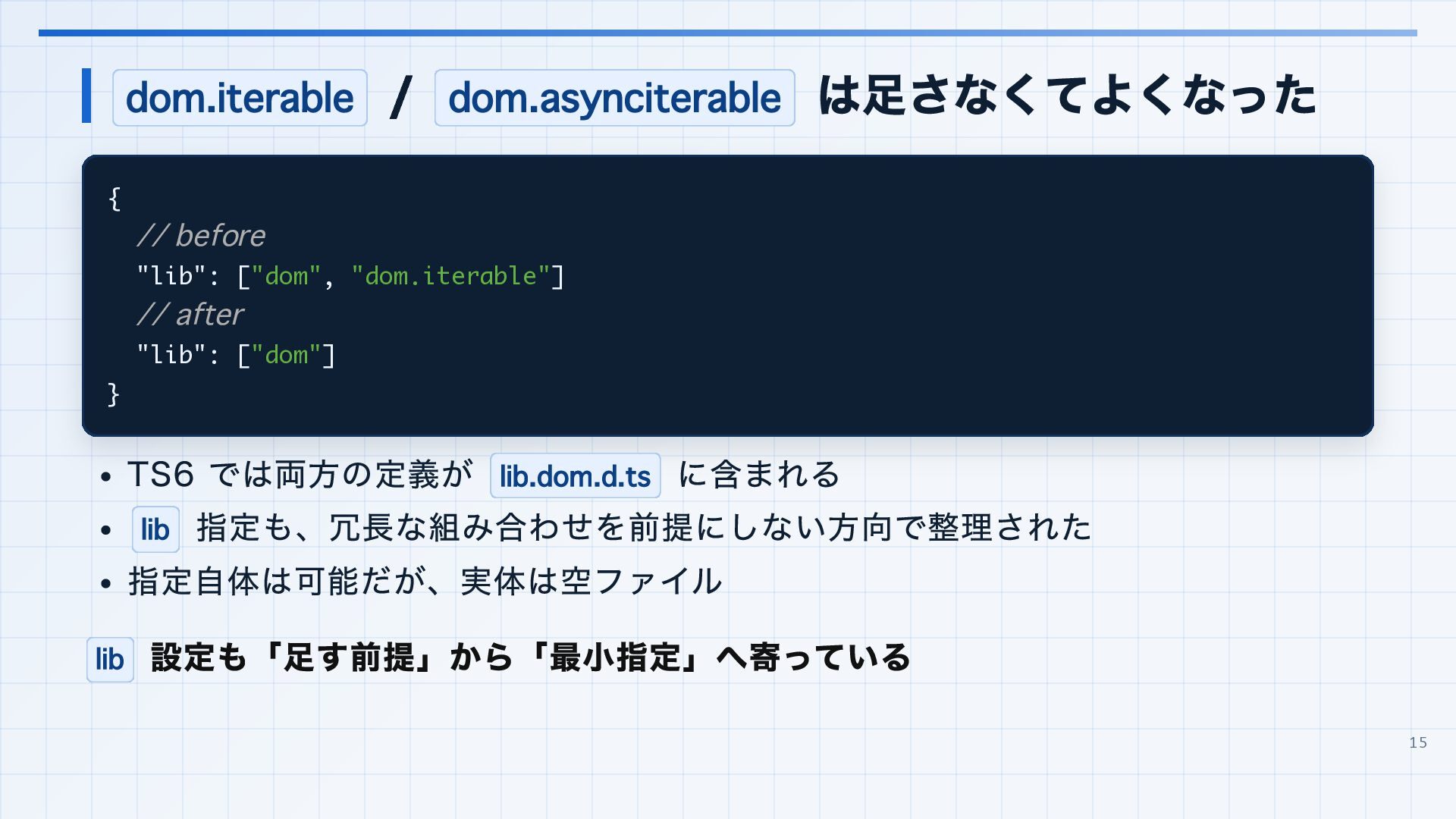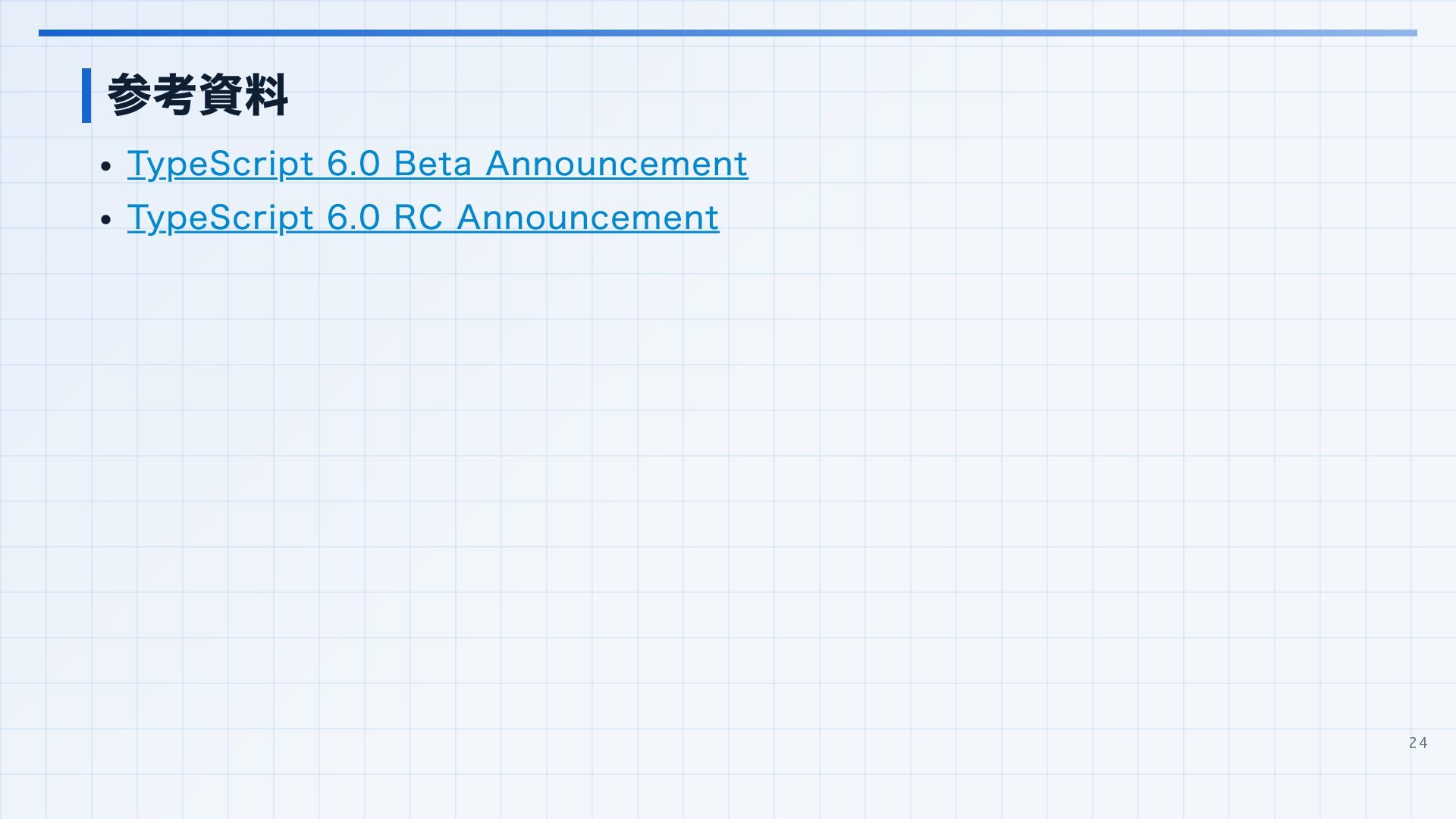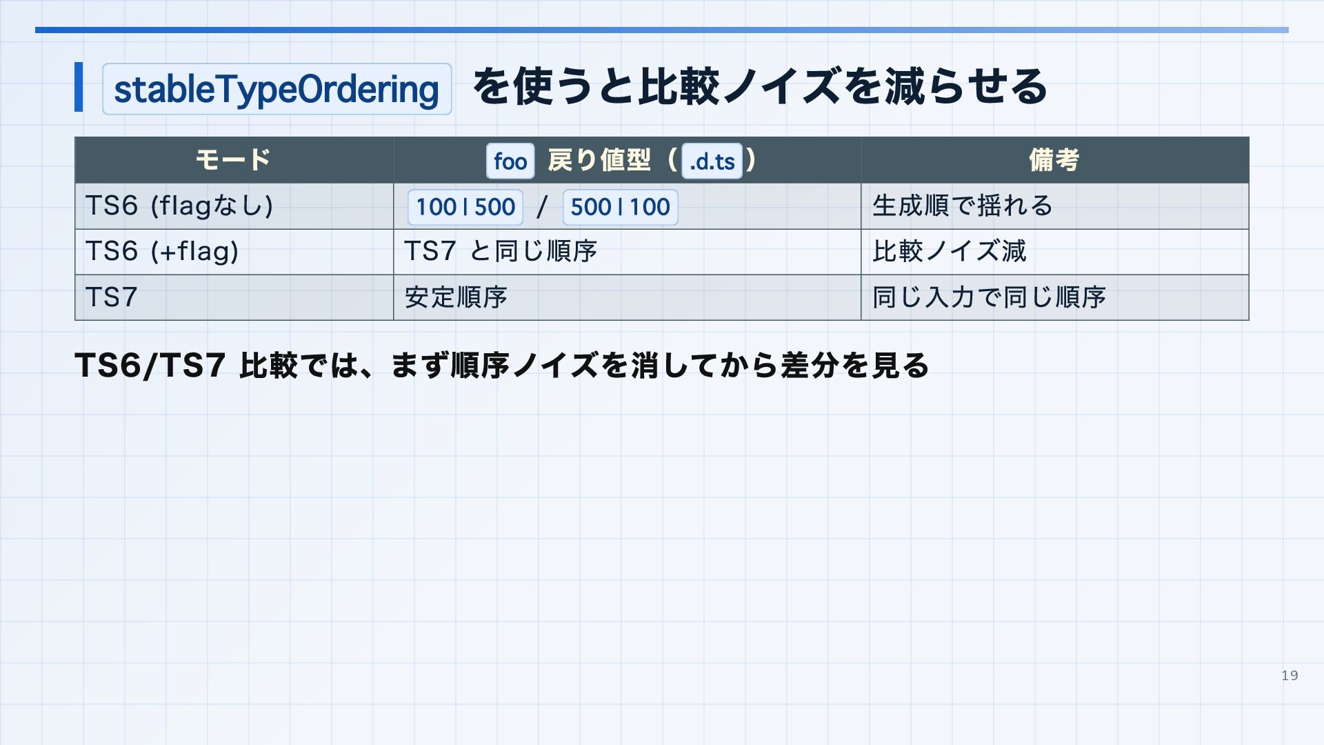 を実行環境に合わせる 3. 見つかった import 解決エラーと非推奨設定を潰す baseUrl は paths 明示へ移行する noUncheckedSideEffectImports で見つかった副作用 import の解決ミスを直す moduleResolution: node は nodenext / bundler へ移行する target: es5 は互換ビルド工程へ分離する 4. import ... with へ構文移行 tsc --noEmit で破壊的変更を確認し、必要に応じて .d.ts / エラーメッセージ差分も 見る 22