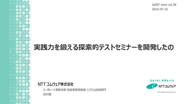 ©︎ NTT COMWARE CORPORATION 2024 コーポレート革新本部 技術革新統括部 システム技術部門 吉村優 実践力を鍛える探索的テストセミナーを開発したの