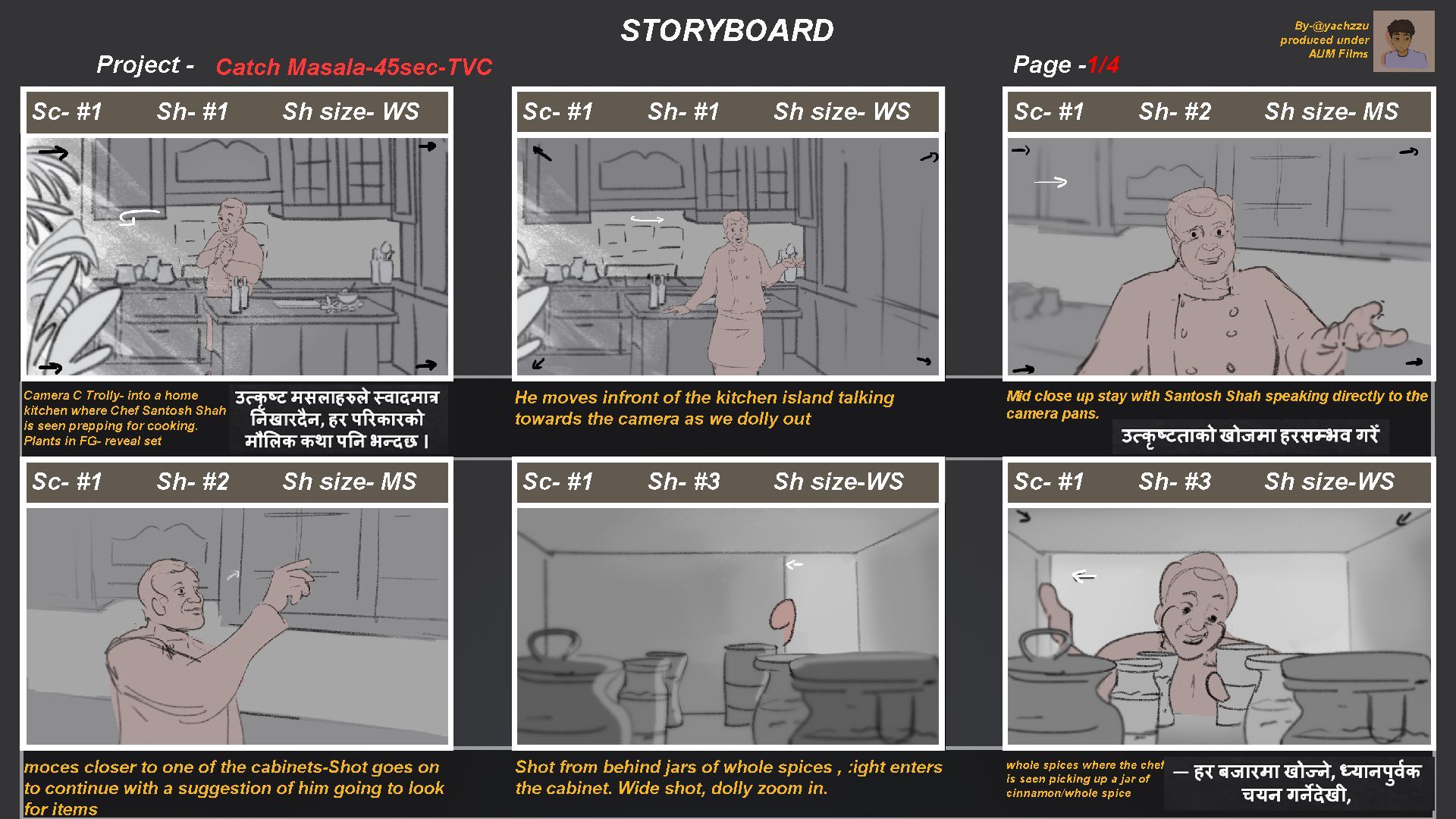 S h s i z e - MS w h o l e s p i c e s w h e r e t h e c h e f i s s e e n p i c k i n g u p a j a r o f c i n n a mo n / w h o l e s p i c e mo c e s c l o s e r t o o n e o f t h e c a b i n e t s - S h o t g o e s o n t o c o n t i n u e w i t h a s u g g e s t i o n o f h i m g o i n g t o l o o k f o r i t e ms S c - # 1 S h - # 3 S h s i z e - WS S h o t f r o m b e h i n d j a r s o f w h o l e s p i c e s , : i g h t e n t e r s t h e c a b i n e t . Wi d e s h o t , d o l l y z o o m i n . S c - # S c - # 1 S h - # 3 S h s i z e - WS S h - # S h s i z e - S c - # 1 S h - # 1 S h s i z e - WS C a me r a C T r o l l y - i n t o a h o me k i t c h e n w h e r e C h e f S a n t o s h S h a h i s s e e n p r e p p i n g f o r c o o k i n g . P l a n t s i n F G - r e v e a l s e t S c - # 1 S h - # 1 S h s i z e - WS H e mo v e s i n f r o n t o f t h e k i t c h e n i s l a n d t a l k i n g t o w a r d s t h e c a me r a a s w e d o l l y o u t S c - # 1 S h - # 2 S h s i z e - MS M i d c l o s e u p s t a y w i t h S a n t o s h S h a h s p e a k i n g d i r e c t l y t o t h e c a me r a p a n s . B y - @y a c h z z u p r o d u c e d u n d e r A U M F i l ms P r o j e c t - P a g e - S T OR Y B OA R D C a t c h Ma s a l a - 4 5 s e c - T V C 1 / 4