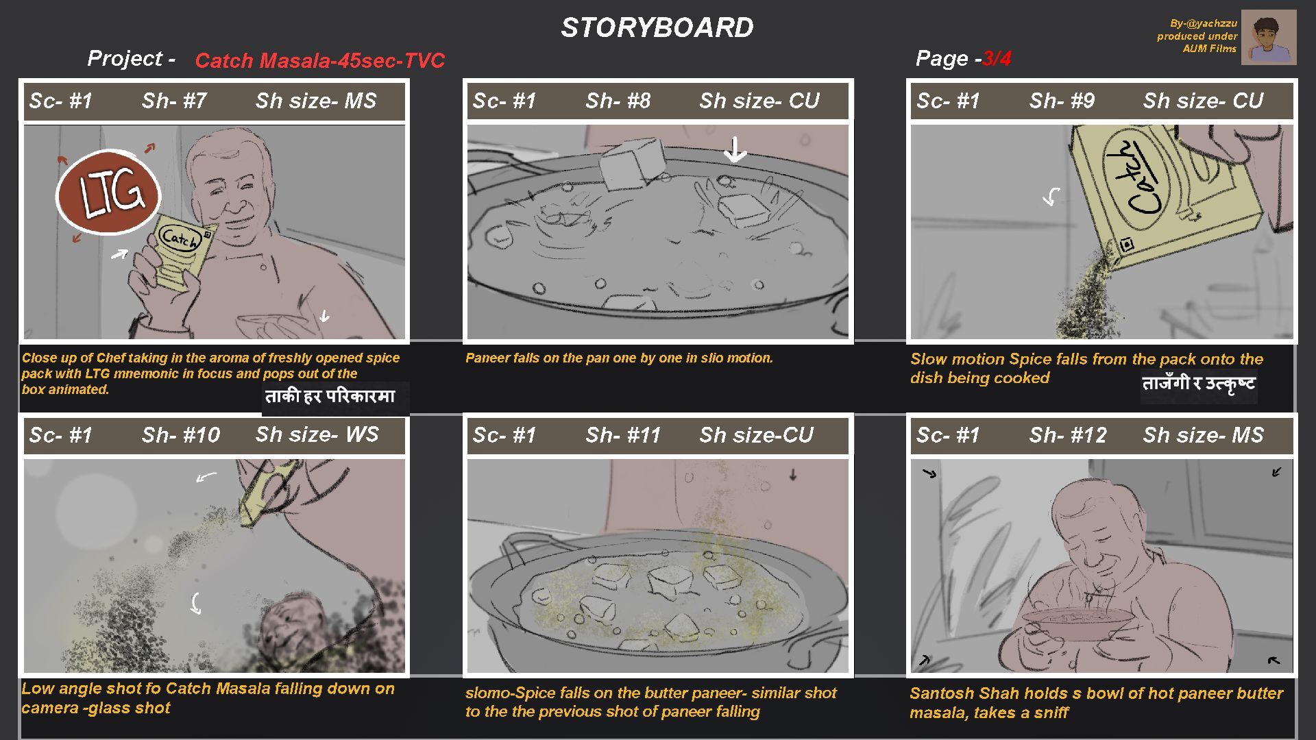 0 S h s i z e - WS L o w a n g l e s h o t f o C a t c h Ma s a l a f a l l i n g d o w n o n c a me r a - g l a s s s h o t S c - # 1 S h - # 1 1 S h s i z e - C U s l o mo - S p i c e f a l l s o n t h e b u t t e r p a n e e r - s i mi l a r s h o t t o t h e t h e p r e v i o u s s h o t o f p a n e e r f a l l i n g S c - # S c - # 1 S h - # 1 2 S h s i z e - MS S h - # S a n t o s h S h a h h o l d s s b o w l o f h o t p a n e e r b u t t e r ma s a l a , t a k e s a s n i f f S c - # 1 S h - # 7 S h s i z e - MS C l o s e u p o f C h e f t a k i n g i n t h e a r o ma o f f r e s h l y o p e n e d s p i c e p a c k w i t h L T G mn e mo n i c i n f o c u s a n d p o p s o u t o f t h e b o x a n i ma t e d . S c - # 1 S h - # 8 S h s i z e - C U P a n e e r f a l l s o n t h e p a n o n e b y o n e i n s l i o mo t i o n . S c - # 1 S h - # 9 S h s i z e - C U S l o w mo t i o n S p i c e f a l l s f r o m t h e p a c k o n t o t h e d i s h b e i n g c o o k e d B y - @y a c h z z u p r o d u c e d u n d e r A U M F i l ms P r o j e c t - P a g e - S T OR Y B OA R D C a t c h Ma s a l a - 4 5 s e c - T V C 3 / 4