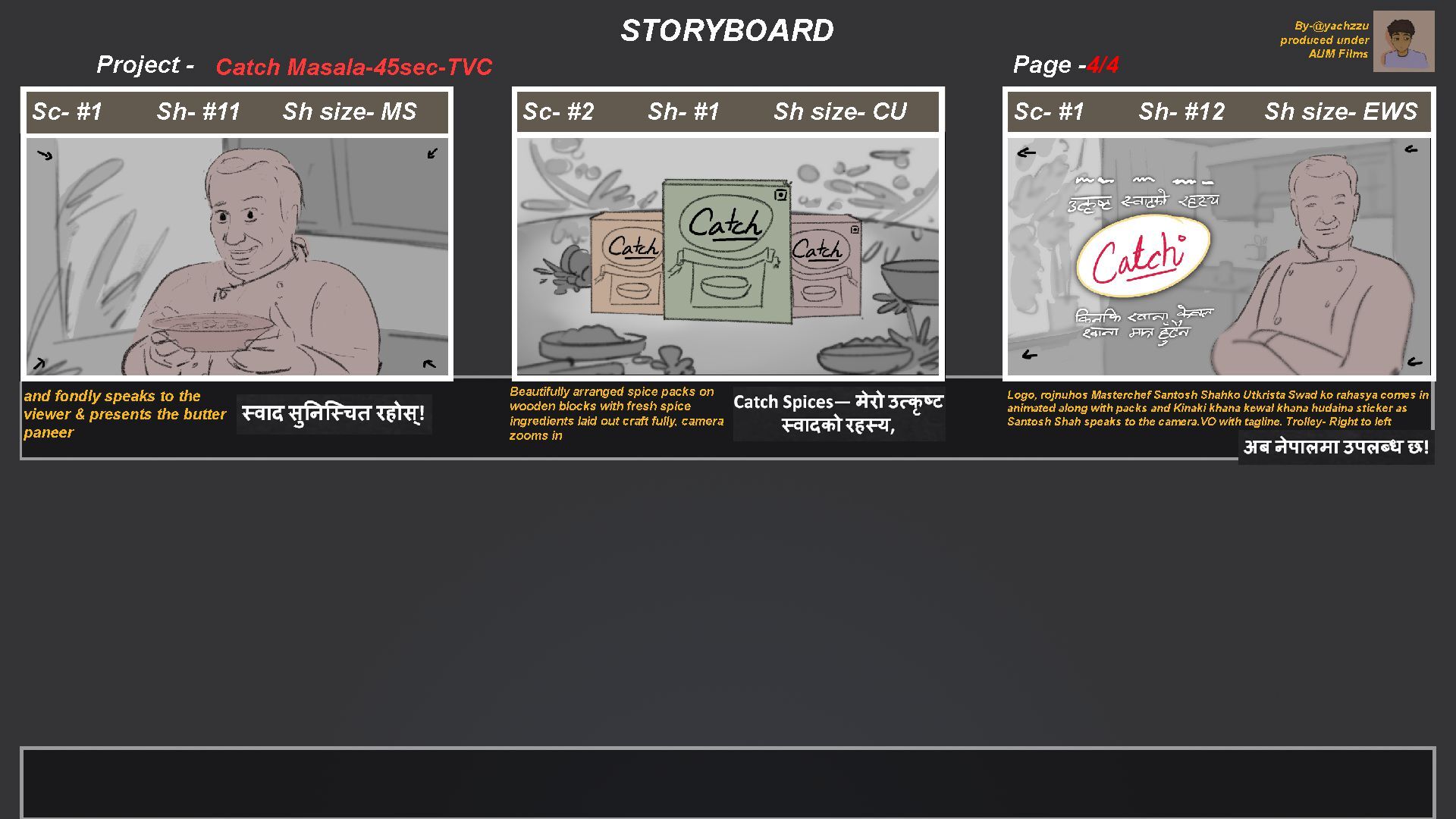 1 S h s i z e - MS a n d f o n d l y s p e a k s t o t h e v i e w e r & p r e s e n t s t h e b u t t e r p a n e e r S c - # 2 S h - # 1 S h s i z e - C U B e a u t i f u l l y a r r a n g e d s p i c e p a c k s o n w o o d e n b l o c k s w i t h f r e s h s p i c e i n g r e d i e n t s l a i d o u t c r a f t f u l l y , c a me r a z o o ms i n S c - # 1 S h - # 1 2 S h s i z e - E WS L o g o , r o j n u h o s Ma s t e r c h e f S a n t o s h S h a h k o U t k r i s t a S w a d k o r a h a s y a c o me s i n a n i ma t e d a l o n g w i t h p a c k s a n d K i n a k i k h a n a k e w a l k h a n a h u d a i n a s t i c k e r a s S a n t o s h S h a h s p e a k s t o t h e c a me r a . V O w i t h t a g l i n e . T r o l l e y - R i g h t t o l e f t B y - @y a c h z z u p r o d u c e d u n d e r A U M F i l ms P r o j e c t - P a g e - S T OR Y B OA R D C a t c h Ma s a l a - 4 5 s e c - T V C 4 / 4